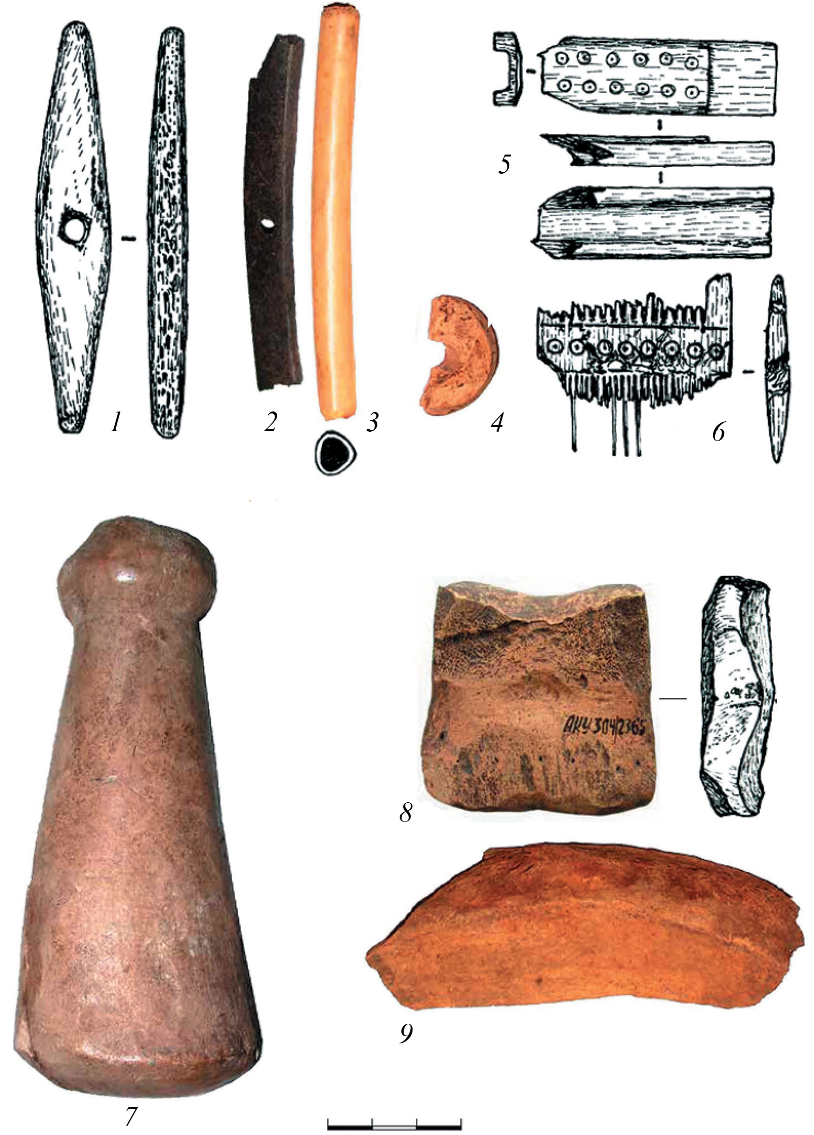 Fig. 4. Items made of bone and antler from the Toretskoye urban settlement: 1 – a product; 2 – a fragment of the saddle edge (mounts); 3 – a tube; 4 – a spindle whorl; 5 – a detail of coin scales; 6 – a comb; 7 – a handle; 8, 9 – product blanks