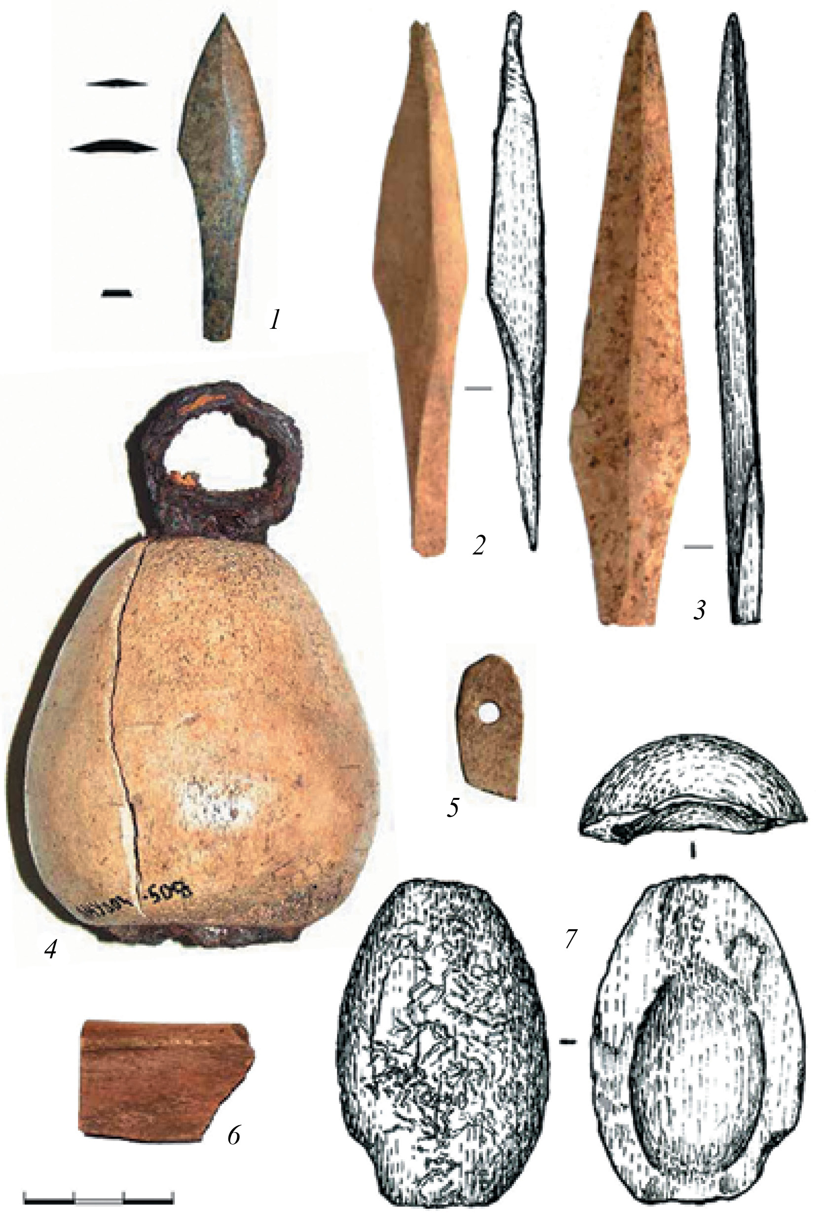 Рис. 5. Изделия из кости и рога Торецкого городского поселения: 1–3 – наконечники стрел; 4, 7 – кистени; 5 – фрагмент накладки (?); 6 – фрагмент изделия.