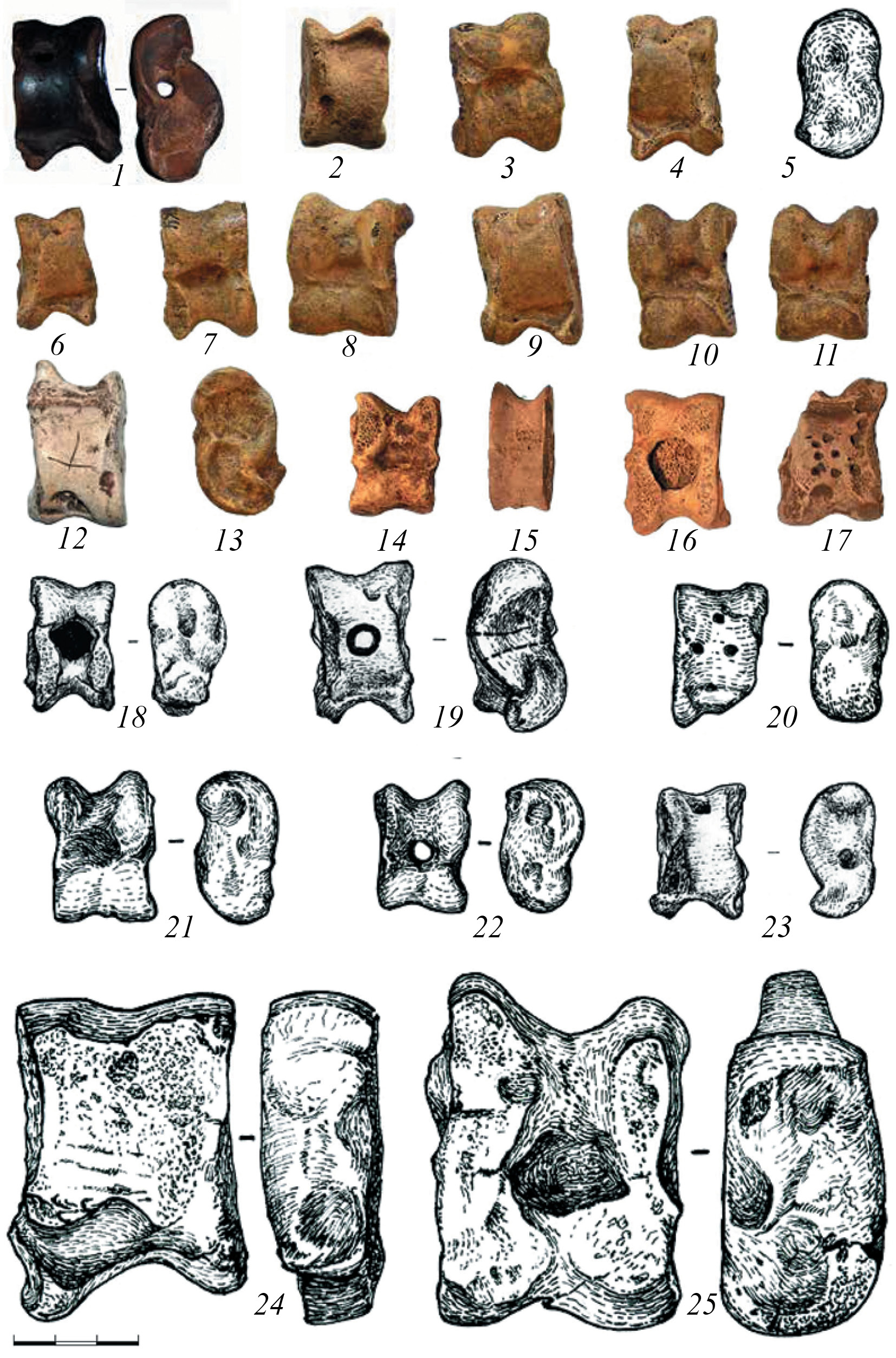Из слоя и объектов происходят астрагалы или альчики – таранные кости мелкого – 32 экз. (рис.6, 1–23) и крупного рогатого скота – 2 экз. (рис. 6, 24, 25).