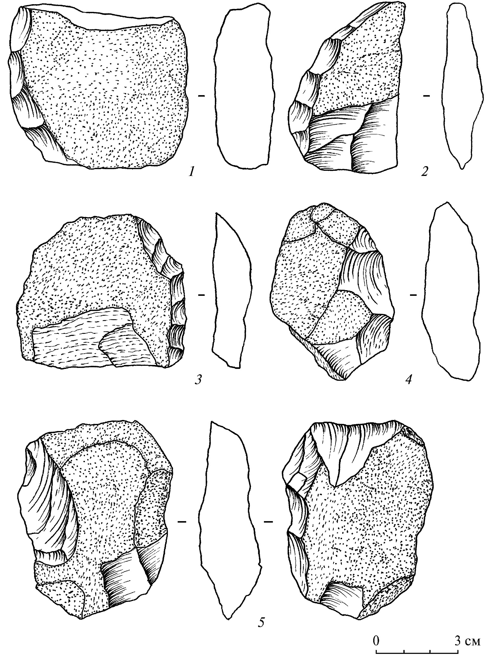 Рис. 3. Мастерская Каракудук. Второй культурно-хронологический комплекс. Нуклеусы (1–5).