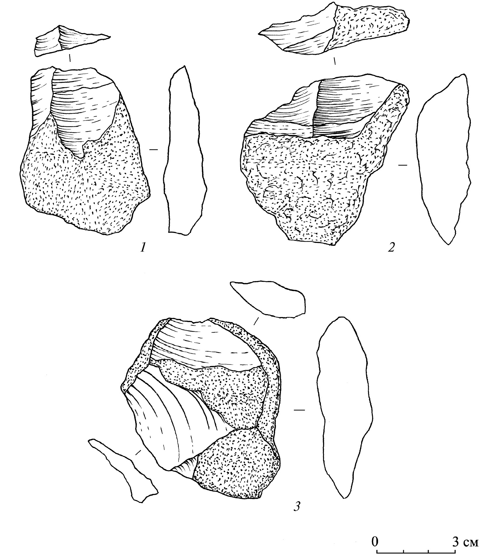 Fig. 7. Karakuduk workshop. The third cultural-chronological complex. Nuclei (1–3)