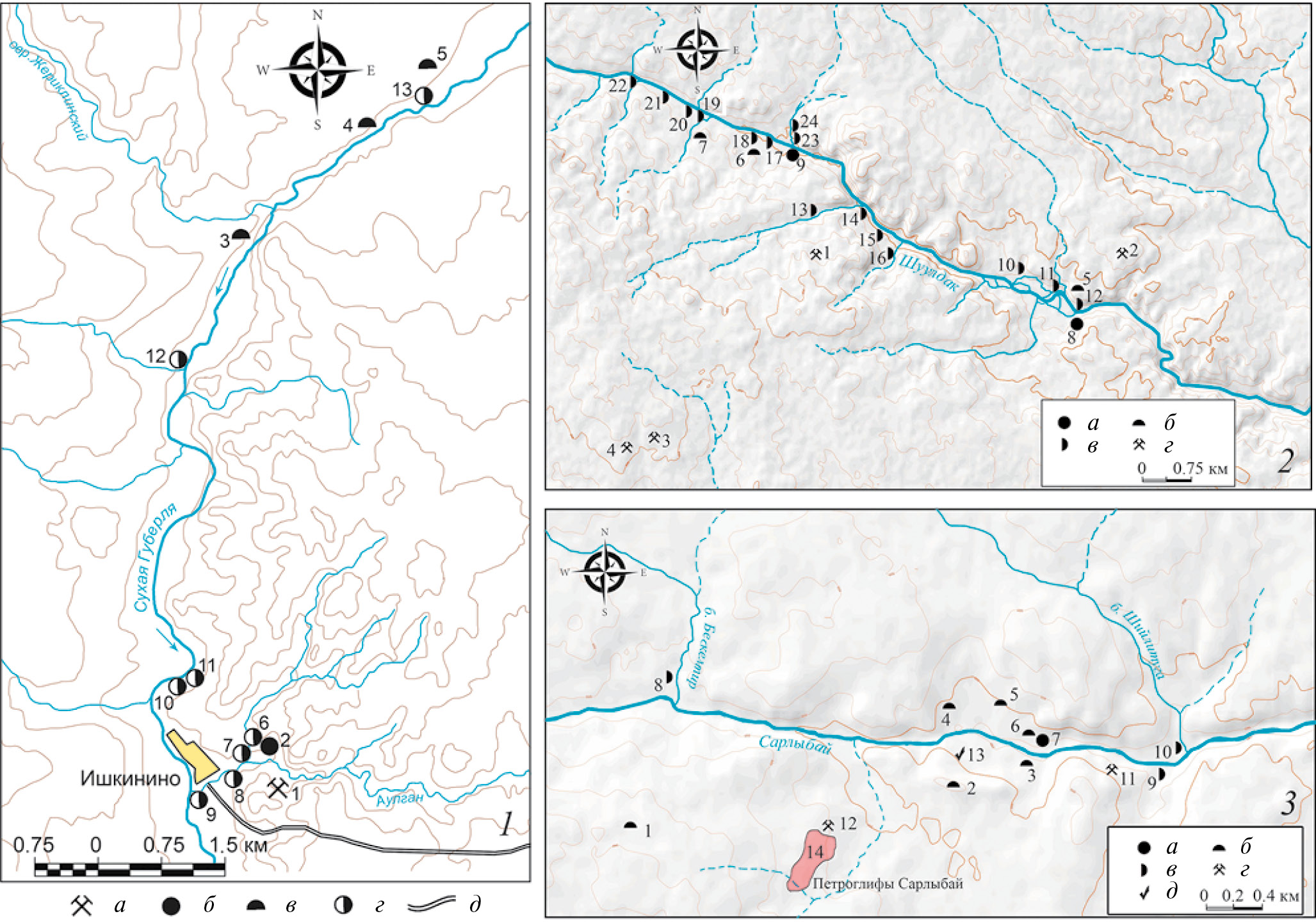 Рис. 3. Локальные центры металлопроизводства Уральско-Мугоджарского ГМЦ: 1 – Ишкининский археологический микрорайон (АМР): 1 – Ишкининский рудник; 2 – Ишкиновка (пос.); 3 – Ишкиновка I (мог.); 4 – Ишкиновка II (мог.); 5 – Ишкиновка III (мог.); 6 – Аулган I; 7 – Аулган II; 8 – Аулган III; 9 – Аулган IV; 10 – Сухая Губерля I; 11 – Сухая Губерля II; 12 – Сухая Губерля III; 13 – Сухая Губерля IV. 2 – Шуулдакский АМР: 1 – Шуулдак (руд.); 2 – Актогай (руд.); 3 – Мысказган (руд.); 4 – Жангана (руд.); 5 – Актогай I (мог.); 6 – Шуулдак I (мог.); 7 – Шуулдак II (курган); 8 – Актогай IV (пос.); 9 – Шуулдак V (пос.); 10 – Актогай I; 11 – Актогай II; 12 – Актогай III; 13 – Шуулдак I; 14 – Шуулдак II; 15 – Шуулдак III; 16 – Шуулдак IV; 17 – Шуулдак VI; 18 – Шуулдак VII; 19 – Шуулдак VIII (пос.); 20 – Шуулдак IX; 21 – Шуулдак X; 22 – Шуулдак XI; 23 – Шуулдак XII; 24 – Шуулдак XIII. 3 – Сарлыбайский АМР: 1 – Сарлыбай I (курган); 2 – Сарлыбай II (мог.); 3 – Сарлыбай III (мог.); 4 – Сарлыбай IV (мог.); 5 – Сарлыбай V (мог.); 6 – Сарлыбай VI (мог.); 7 – Сарлыбай III (пос.); 8 – Сарлыбай V; 9 – Сарлыбай I; 10 – Сарлыбай IV; 11 – Сарлыбай I (руд.); 12 – Сарлыбай II (руд.); 13 – Сарлыбай (менгир); 14 – Сарлыбай (святилище с петроглифами). Условные обозначения. 1: а – рудник; б – поселение; в – могильник; г – местонахождение артефактов; д – дорога. 2: а – поселения; б – могильники; в – местонахождения; г – рудники. 3: а – поселения; б – могильники; в – местонахождения; г – рудники; д – менгир.