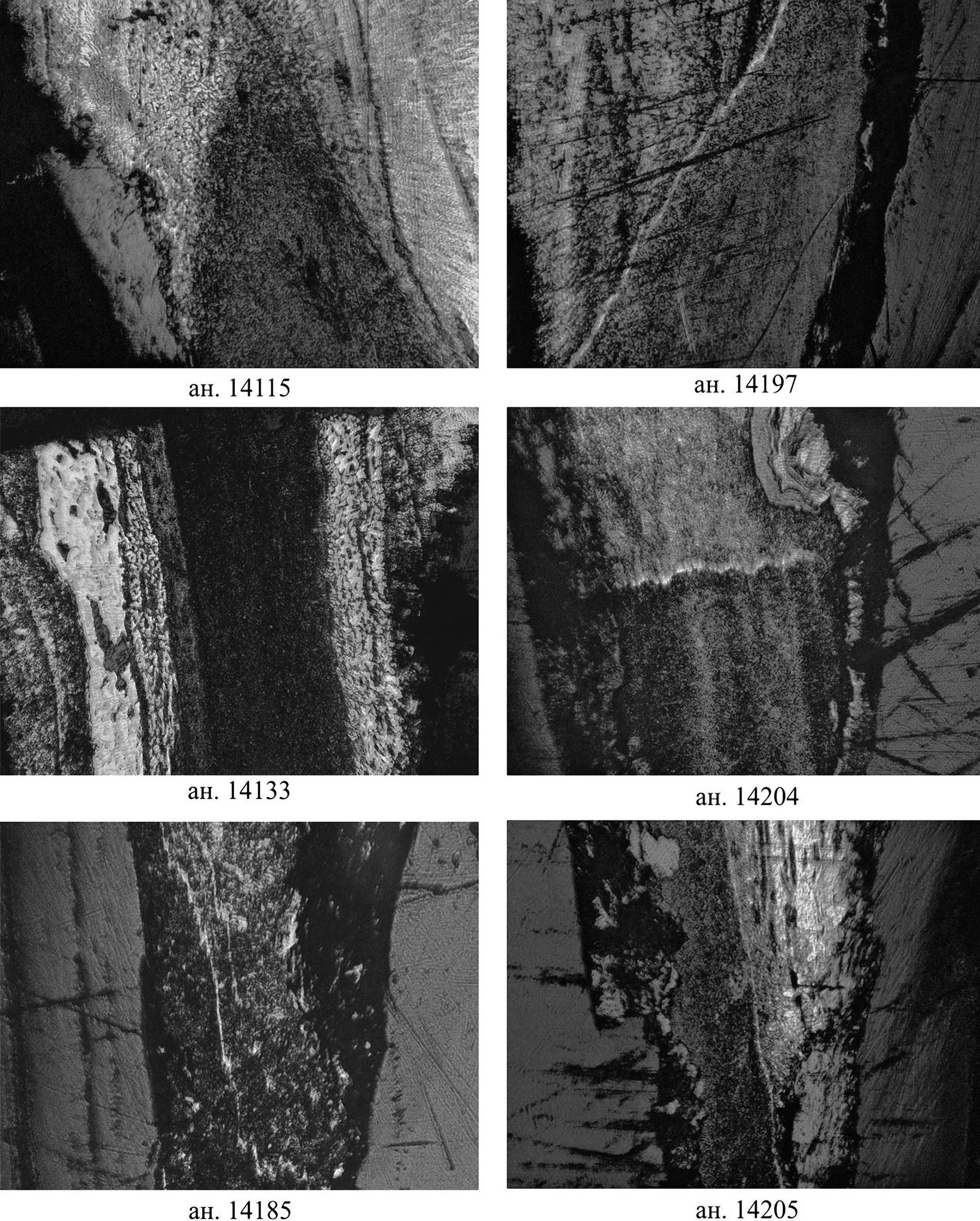 Рис. 3. Сварные швы на ножах селища Катышево 1, фото (40х). Ан. 14115 – вварка с последующей наваркой, XII–XIV вв.; ан. 14133 – пакетирование, XII–XIV вв.; ан. 14185, 14197 – косая наварка, XII–XIV вв.; ан. 14204 – торцовая наварка, XIV в.; ан. 14205 – косая наварка, XIV в.