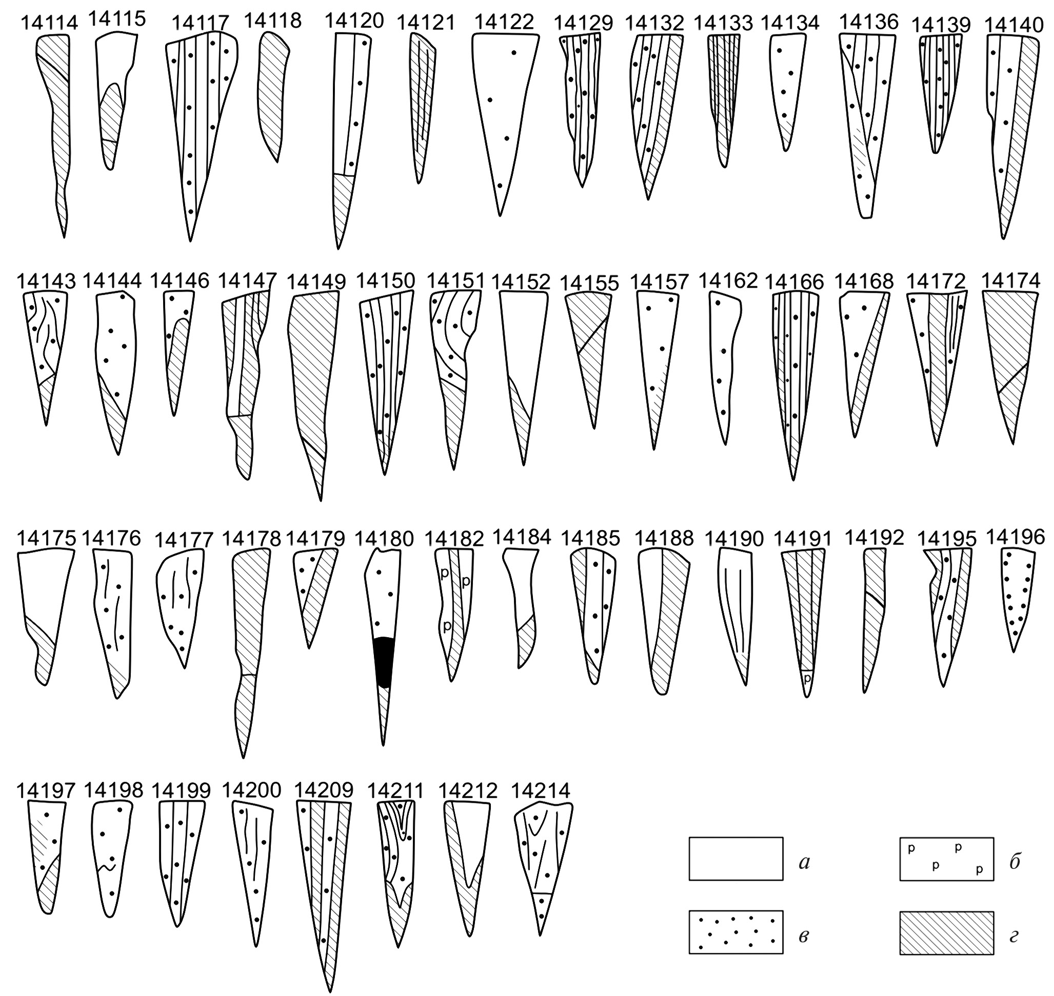 Помимо технологических данных при работе с выборкой селища Катышево получена информация о форме ножей (рис. 2). Только три экземпляра (менее 3%) не имеют уступа со стороны спинки при переходе от клинка к черенку (ан. 14147, 14193, 14198). На этом основании авторы, вслед за отечественными специалистами (Завьялов и др., 2012. С. 17), рассматривают их как ножи “финской” группы. Остальные ножи относятся к группе “древнерусских” (Завьялов и др., 2012. С.17): отличаются от описанных выше уступами при переходе от клинка к относительно короткому черенку. Клинок ножей этой группы широкий, в ряде случаев сильно сточен. Такая форма орудий характерна для материальной культуры населения Северо-Восточной Руси в период развитого и позднего средневековья.