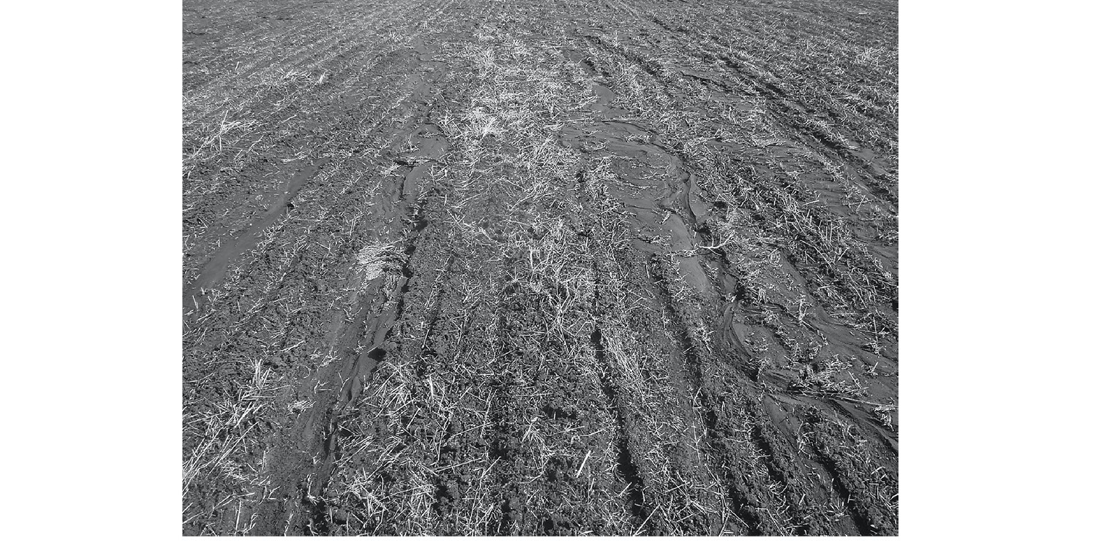 Рис. 2. Струйчатые размывы при вспашке вдоль склона. Северный массив участка Долгий Лог, апрель 2011 г.