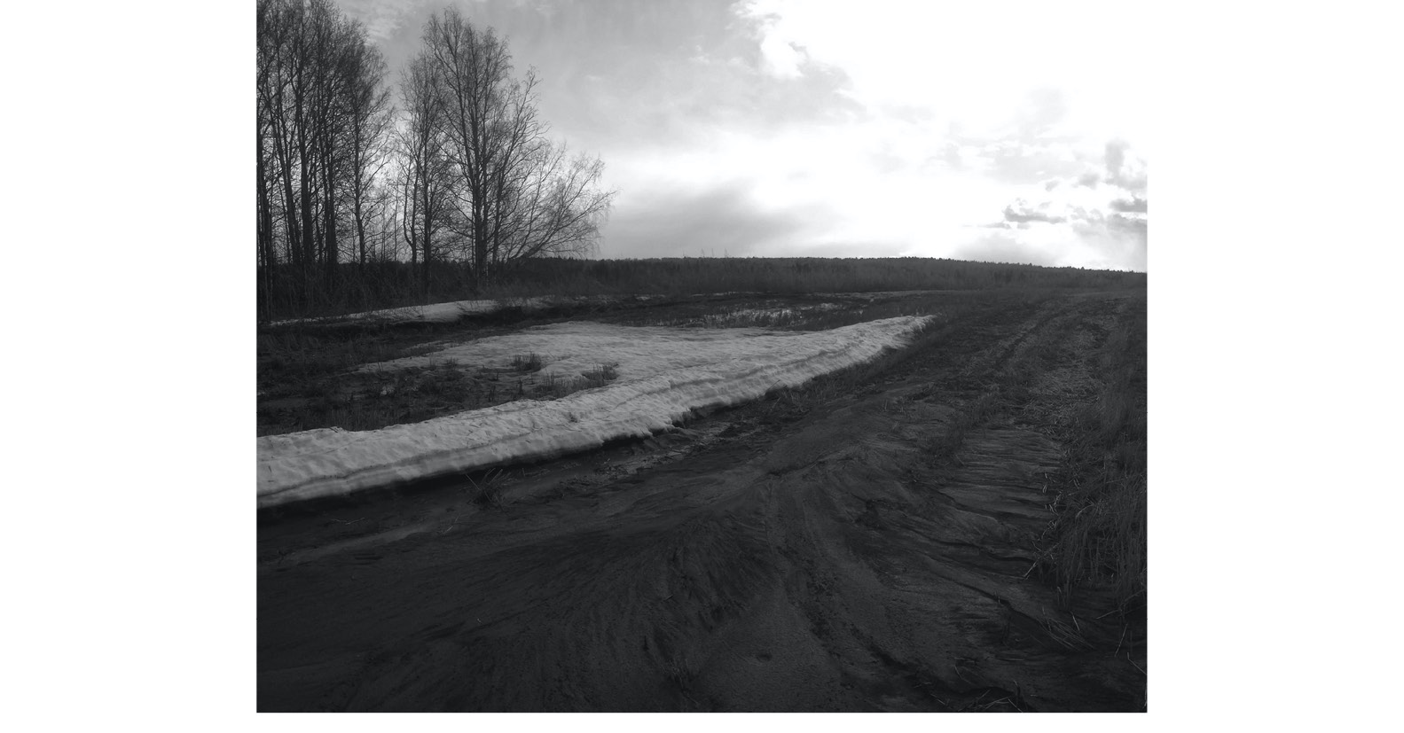 Рис. 8. Поздневесенний сугроб и аккумуляция продуктов смыва в восточной части северного массива уч. Долгий Лог, апрель 2017 г.