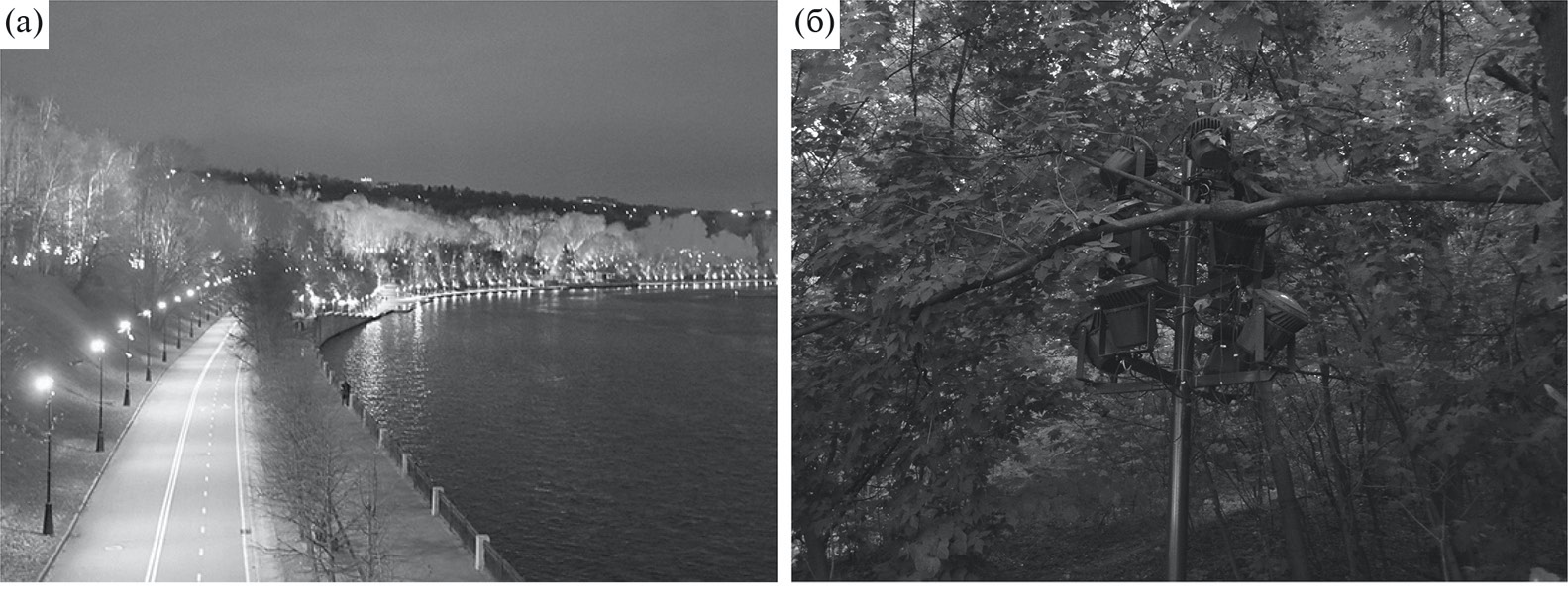 Искусственное освещение в природном заказнике «Воробьевы горы» появилось в 2018 г., когда были смонтированы установки ландшафтного освещения (1000 опор по 12 светодиодных прожекторов на каждом). Прожектора направлены в кроны деревьев. Опоры установлены в 3–5 рядов по нижнему ярусу склона и тянутся вдоль всей набережной (рис. 2). В ходе запрограммированного светоцветового сценария последовательно сменяются красный, желтый, зеленый и синий цвета световых лучей. Заметим, что при освещении монохроматическим желтым, оранжевым и красным спектрами световой волны птицы дезориентируются в полете [43]. Ландшафтное освещение включается ежедневно, через 15 минут после захода Солнца и работает до полуночи, т. е. время работы освещения варьируется от 2 ч 27 мин в дни летнего солнцестояния до 7 ч 49 мин в дни зимнего солнцестояния. Черные мачты освещения, воздушная электропроводка нарушают гармонию природных ландшатов, снижая их рекреационную ценность (см. выше) (рис. 3б).