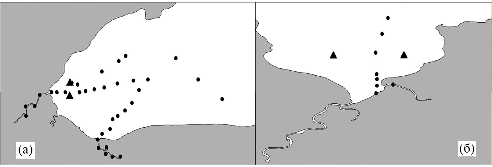 Рис. 2. Расположение гидролого-гидрохимических станций (кружки) в кутовой части Ульбанского (а) и Тугурского (б) заливов. Треугольником отмечены места встреч с гренландскими китами в Ульбанском (23, 9 и 9 животных утром и в полдень 14.09.2022 г. и вечером 15.09.2022 г. соответственно) и Тугурском (9 животных утром 17.09.2022 г.) заливах