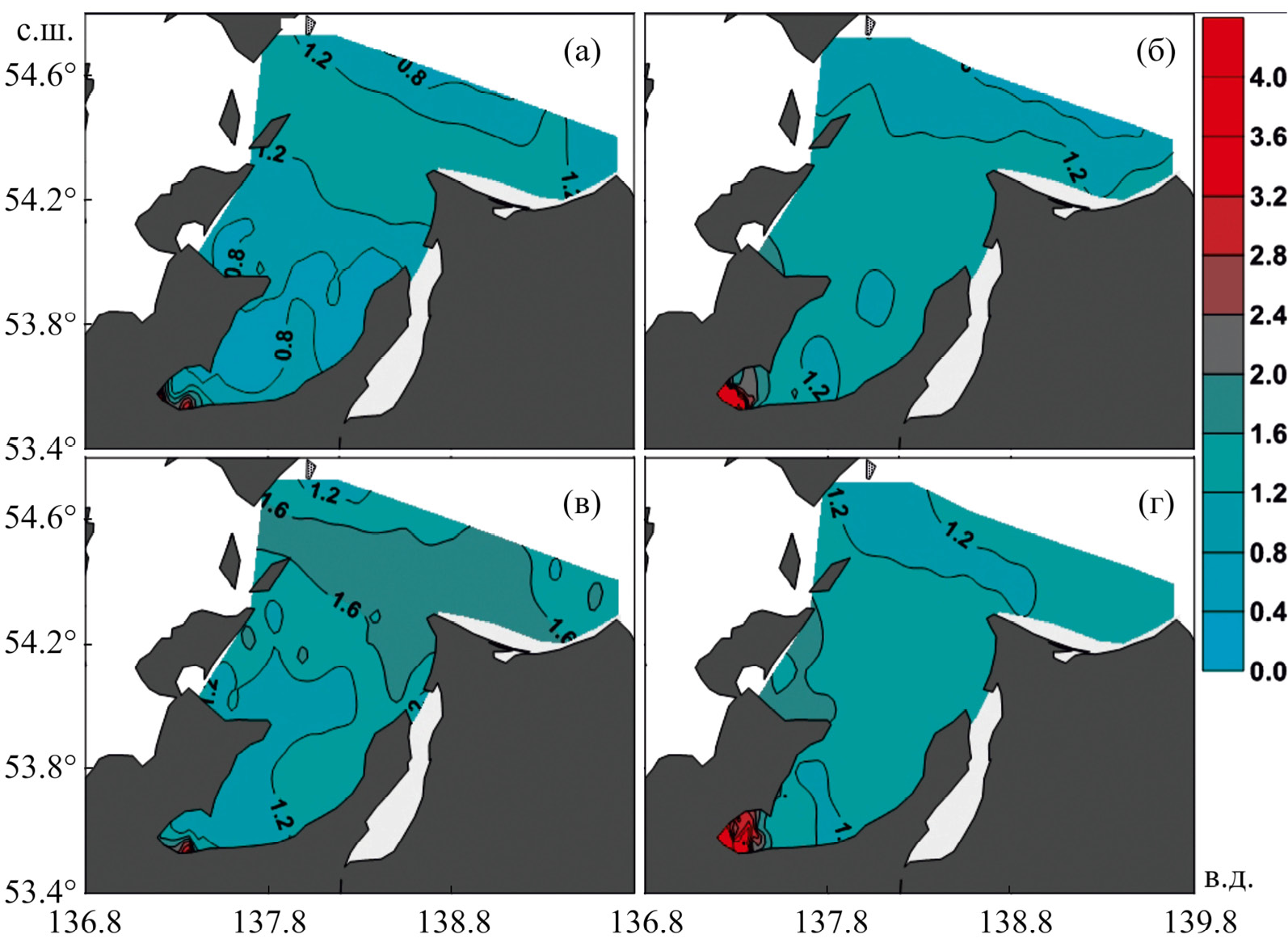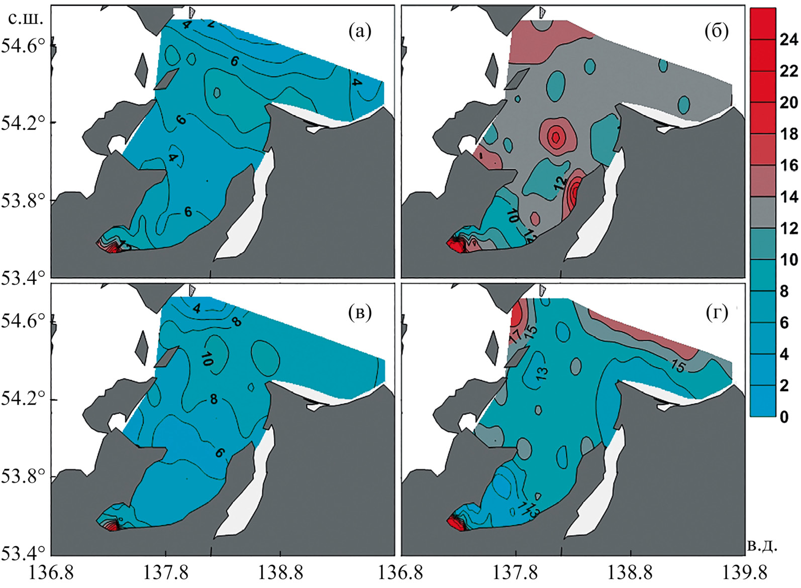 Рис. 4. Распределение концентрации Ntot (мкмоль/л) в зал. Академии в июле 2016 г. (а, в) и сентябре 2022 г. (б, г) в поверхностном (а, б) и придонном (в, г) слоях воды