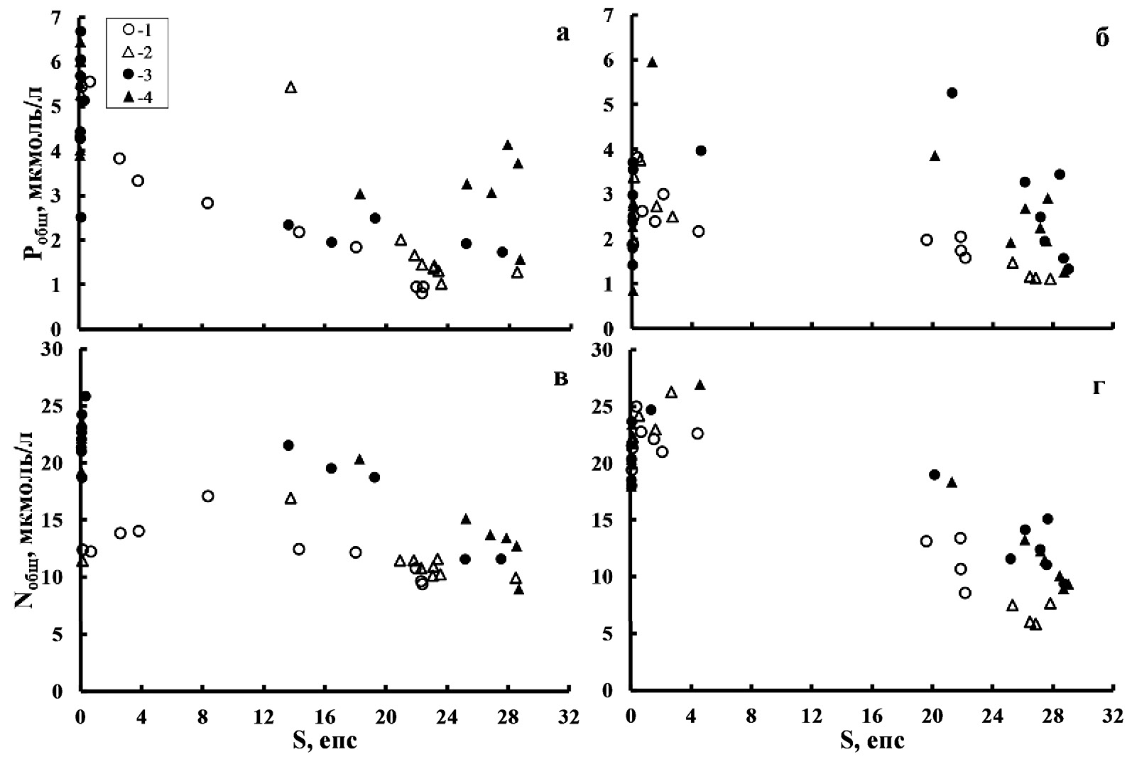 Рис. 5. Распределение концентраций общего фосфора (Ptot, а, б) и общего азота (Ntot, в, г) в зависимости от солености (епс – единицы практической солености) для эстуариев рек Сыран (а, в) и Ульбан (б, г). Исследования р. Сыран проводились 14.07.2016 г. и 14.09.2022 г., р. Ульбан ‒ 26.07.2016 г. и 15.09.2022 г. 1, 2 соответствуют результатам 2016 г., а 3, 4 – 2022 г. Кружками отмечены поверхностные воды, треугольниками – придонные