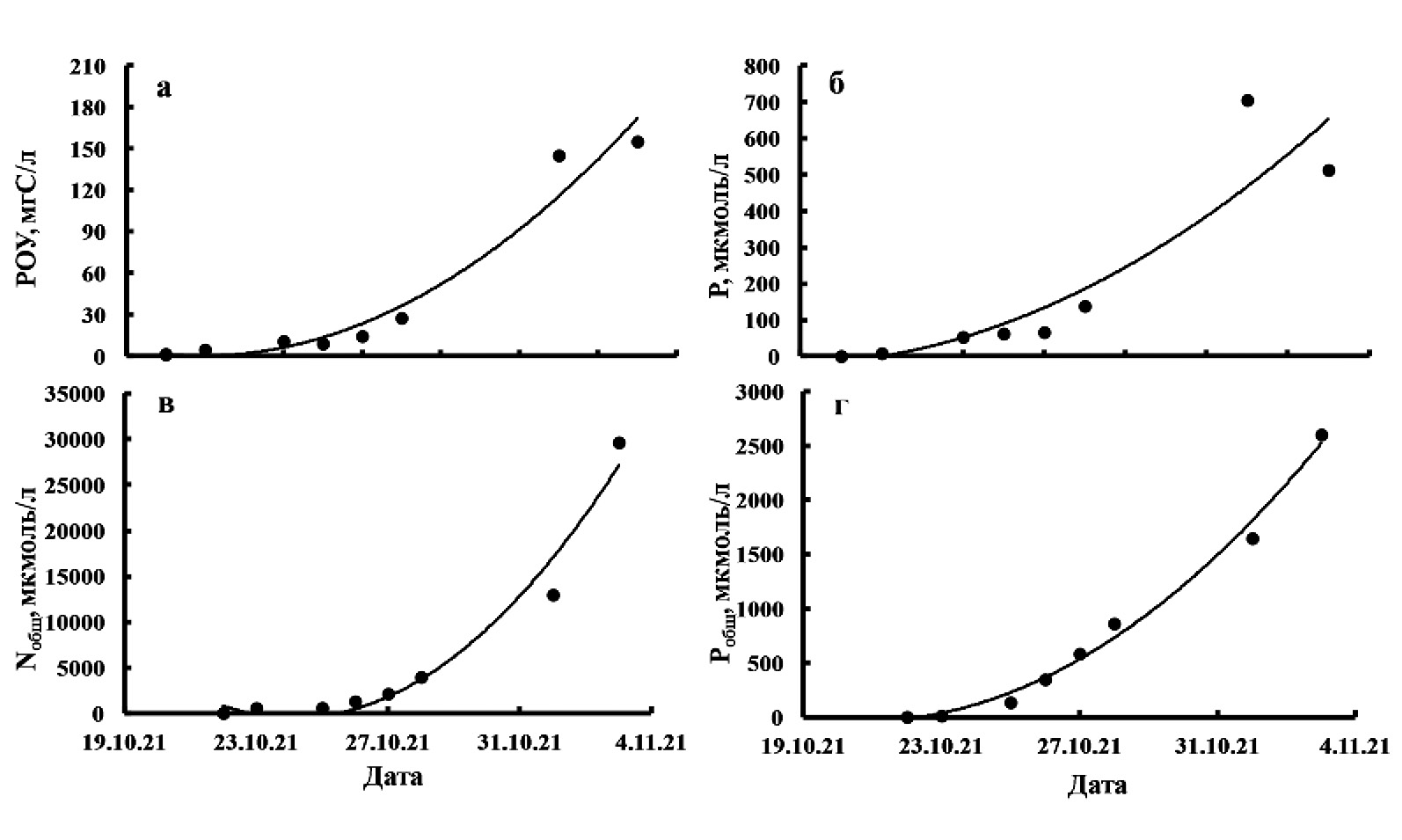 Рис. 6. Рост концентраций растворенного органического углерода (а), неорганического фосфора (б), общего азота (в) и общего фосфора (г) в речной воде в зависимости от времени (8 кг свежевыловленной кеты в 200 л воды из р. Барабашевка)