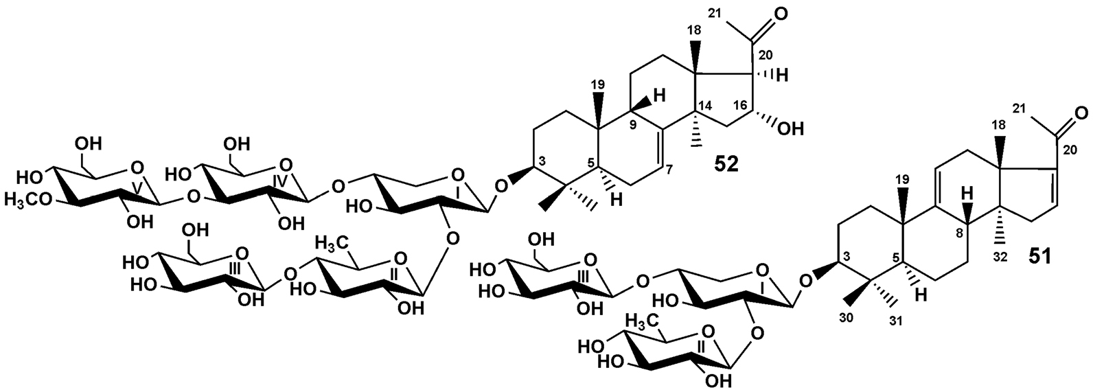 Из суммы десульфатированных производных, полученных в 1991 г. сольволизом нативных гликозидов в смеси безводных пиридина и диоксана для того, чтобы облегчить задачу их хроматографического разделения, были выделены DS-курилозид L (51) и DS-курилозид М (52) (рис. 8). Гликозид 51 имел трисахаридную углеводную цепь, разветвленную по первому моносахаридному остатку (ксилозы), являясь «горячим» метаболитом и ключевым звеном в биосинтезе тетраозидов, пентаозидов и гексаозидов.