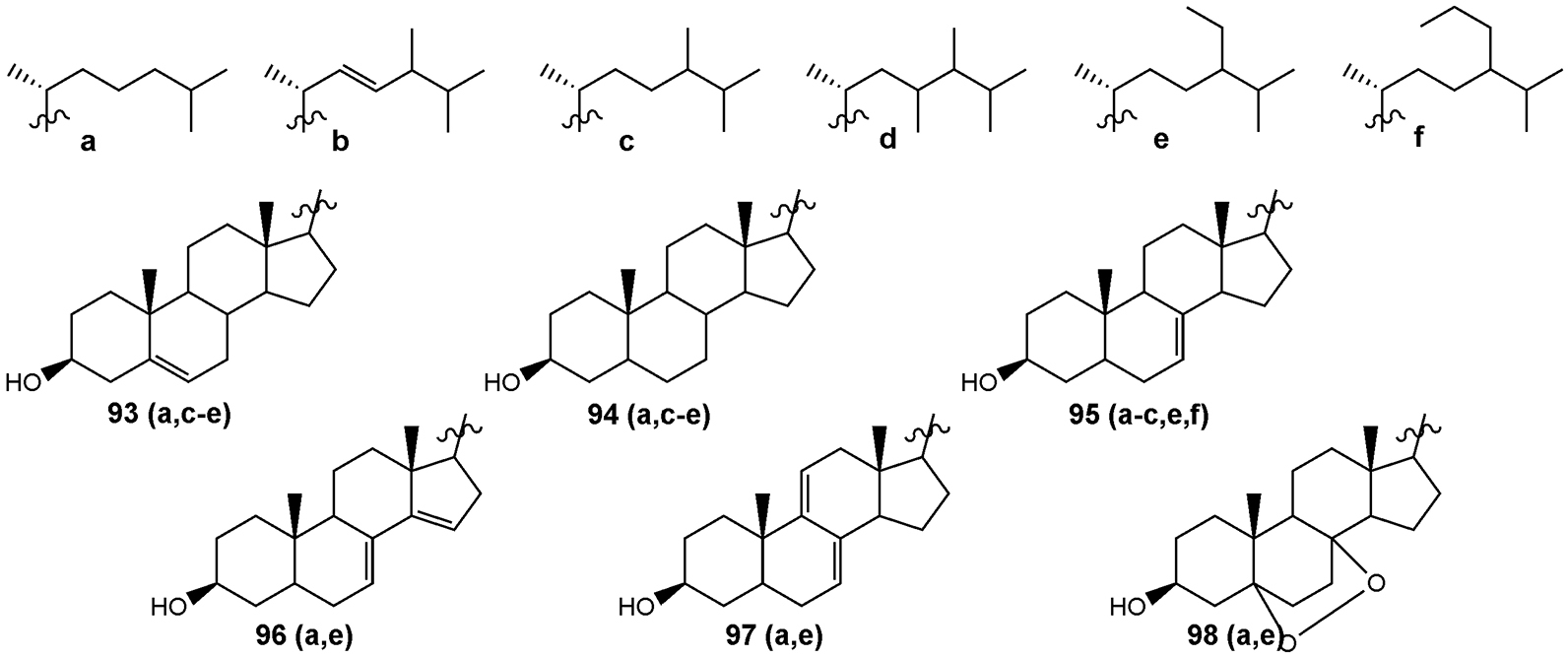 В нашей лаборатории также был изучен состав свободных стеринов голотурии Orphnurgus cf. glaber Walsh, 1891 – редкой глубоководной голотурии, собранной в Тихом океане с глубины 2231 м. В результате этого исследования были найдены соединения 93 (a, c-e), 94 (а, c-e), 95 (а-c, e, f), 96 (а, e), 97 (а, e), 98 (а, e) (рис. 16) [36]. Структурную идентификацию веществ выполнили с помощью ГЖХ/МС, а также спектроскопии ЯМР отдельных фракций.