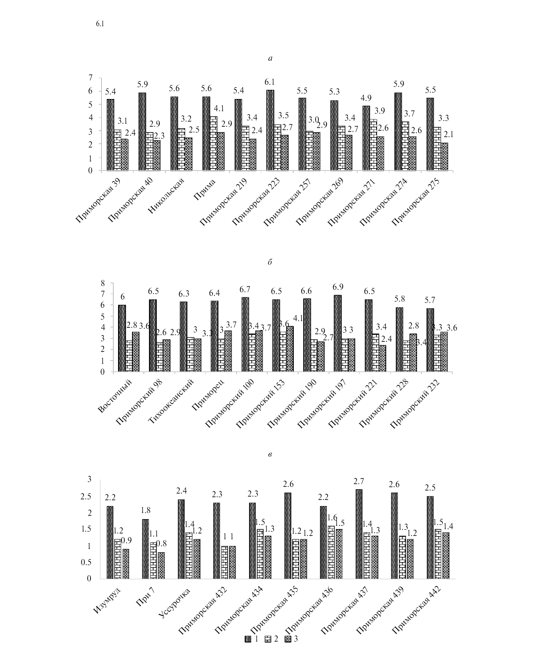 Приморский 228* | 54–79 | 70,9 | 1,5–2,1 | 1,7 | 6,3–7,0 | 6,3 | 17,3–19,5 | 31,0 |