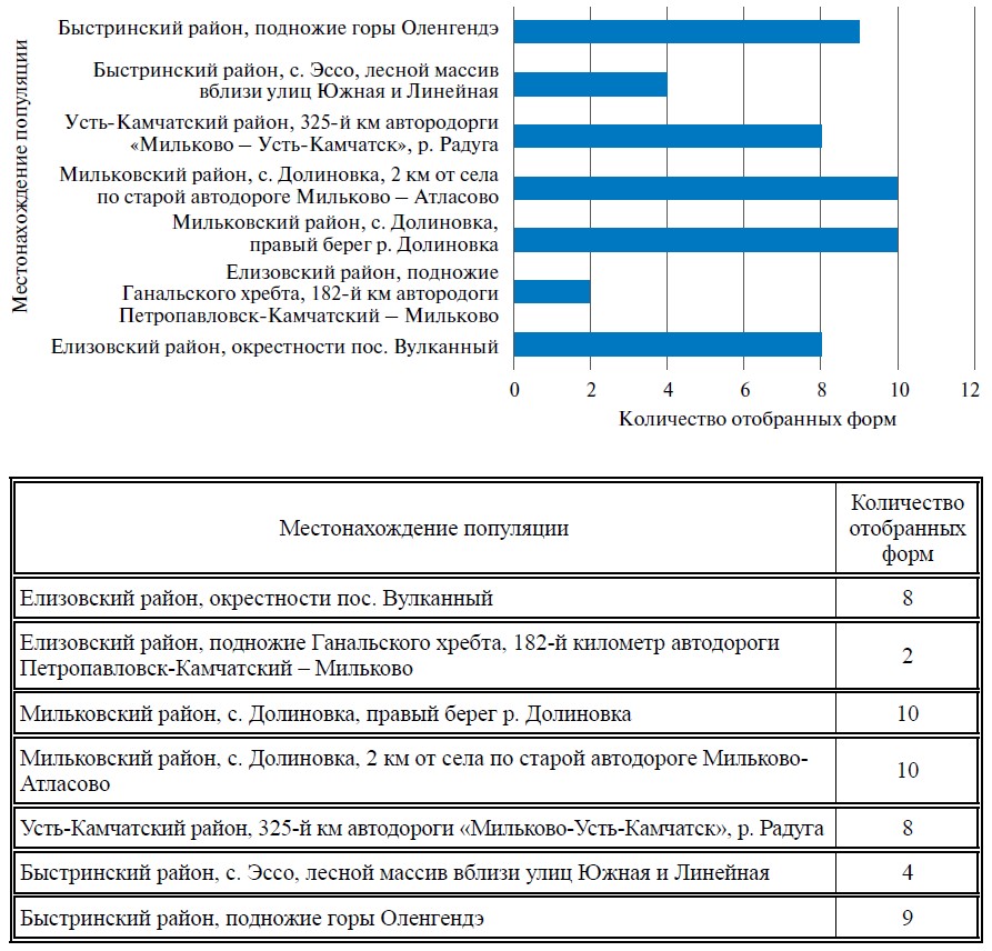 Рис. 2. Количество отобранных дикорастущих форм жимолости камчатской в различных популяциях на территории Камчатского
