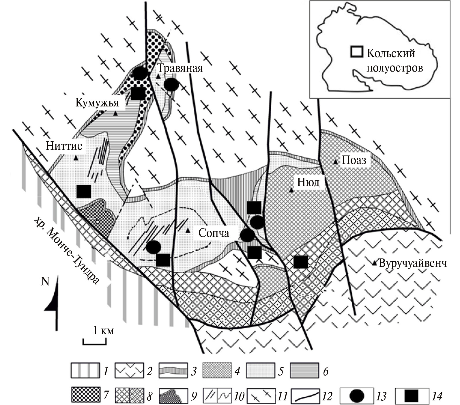 Рис. 1. Геологическая карта Мончегорского плутона с указанием местонахождения образцов, использованных в данном исследовании. 1 – габбро-нориты Мончетундровского массива; 2 – вулканогенно-осадочные комплексы; 3–9 – образования Мончегорского плутона: 3 – краевая быстроохлажденная зона, 4 – норитовая зона, 5 – пироксенитовая зона, 6 – перидотитовая зона, 7 – нижняя часть этой зоны, 8 – метаморфизованные породы, 9 – линза дунитов с габброидной оторочкой; 10 – сульфидное оруденение; 11 –архейские породы; 12 – тектонические нарушения; 13 – места отбора проб для изотопного анализа из работы [5]; 14 – места отбора проб для изотопного анализа из работы [12]. Рисунок модифицирован из работ [9, 11]