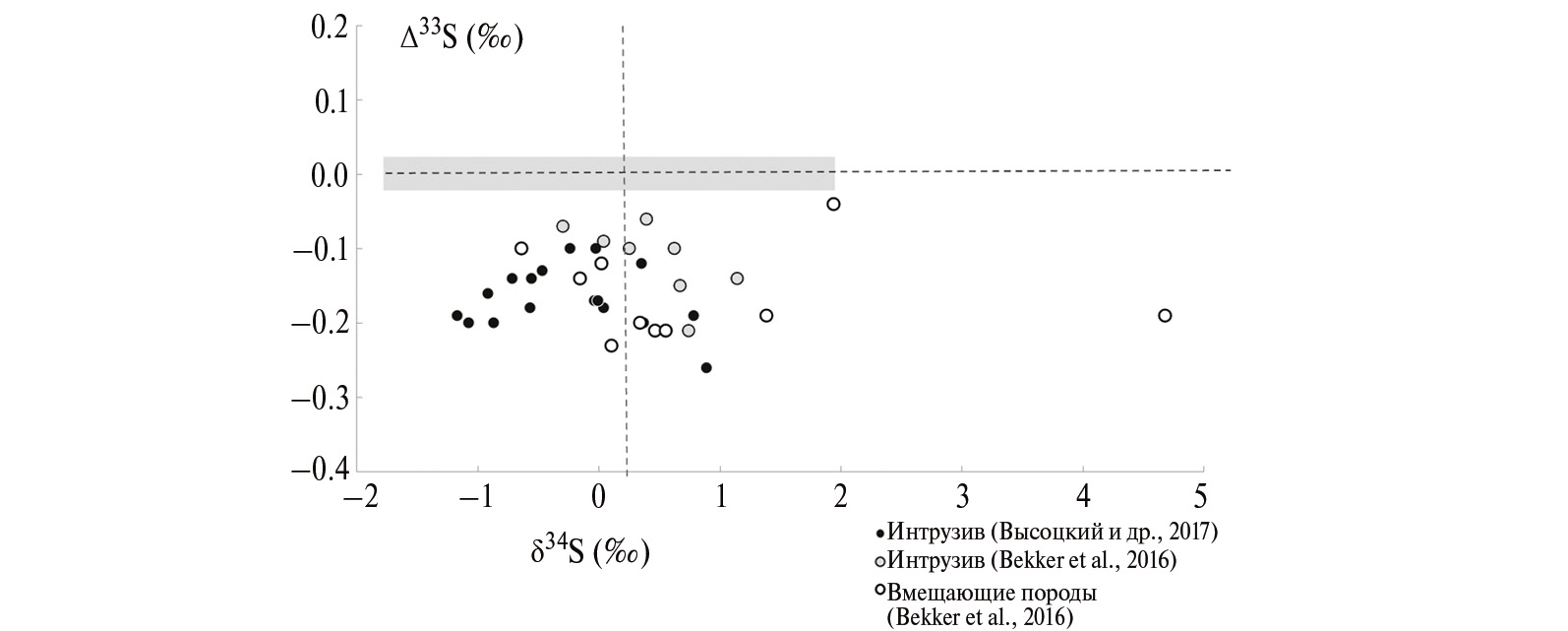 Рис. 2. Значения изотопного состава серы (δ34S) и изотопной аномалии серы (∆33S), измеренные в образцах сульфидной минерализации Мончегорского плутона. Для сравнения сплошной серой зоной показана область значений δ34S и ∆33S, отвечающих мантийному источнику серы [4, 14]