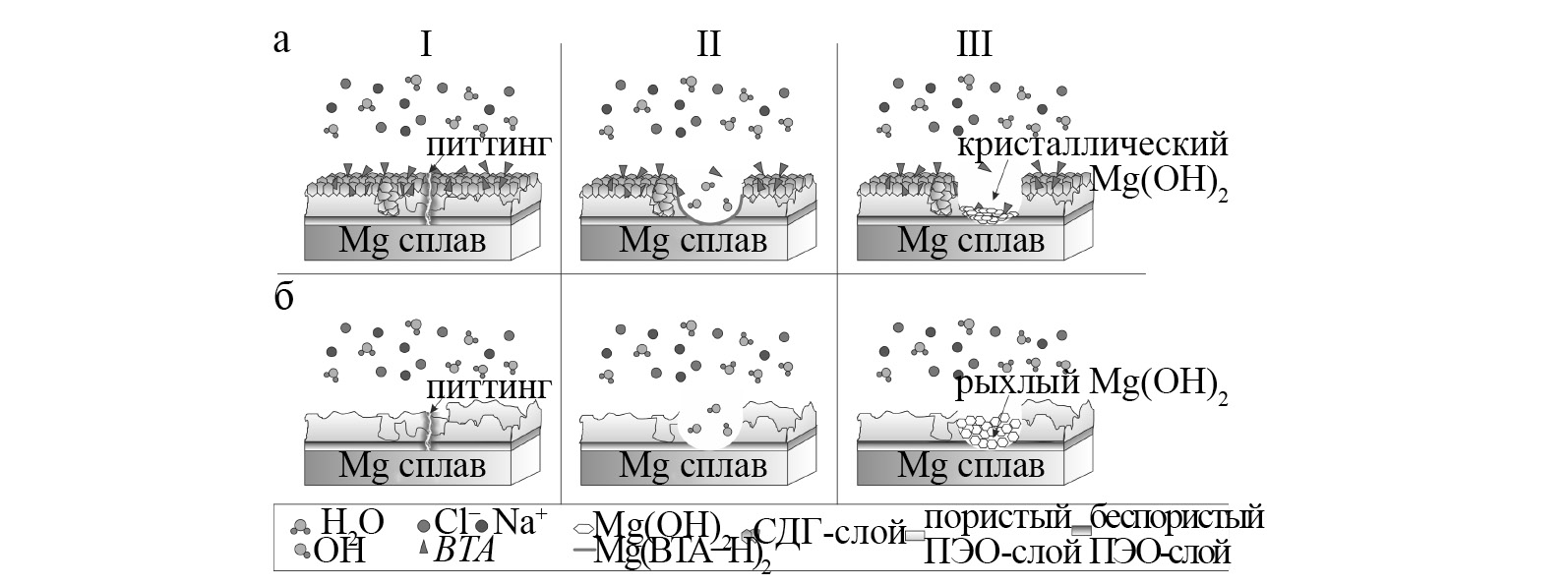 Рис. 4. Механизм коррозионной деградации магниевого сплава с ПЭО-СДГ(BTA)-покрытием (а) и базовым ПЭО-покрытием (б). I – в покрытии возникает дефект (а, б); II –инициация коррозионного процесса, приводящая к растворению магниевой матрицы (а, б); диффузия BTA в дефектную зону с возможным образованием Mg(BTA-Н)2 (а); III – молекулы BTA и слой Mg(BTA-Н)2 ингибируют процесс коррозии, в результате чего образуется кристаллический Mg(OH)2 (а); рыхлые продукты Mg(OH)2 образуются в зоне дефекта базового ПЭО-покрытия (б) [46]