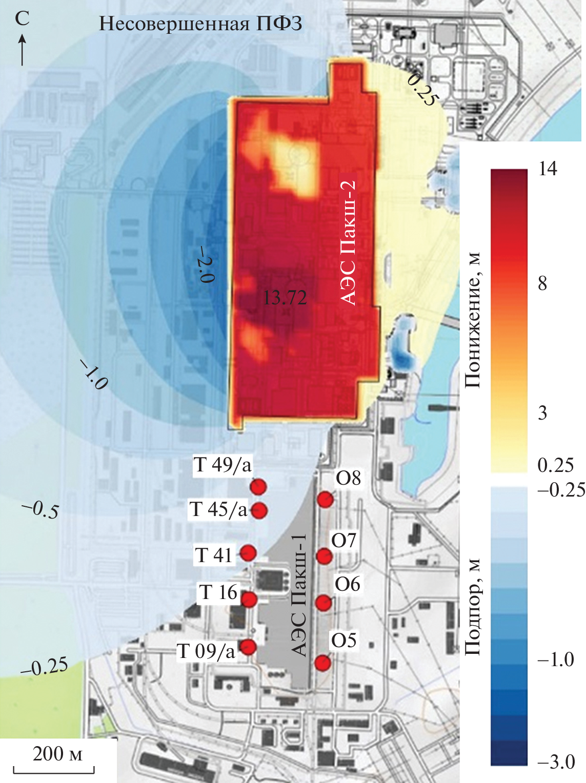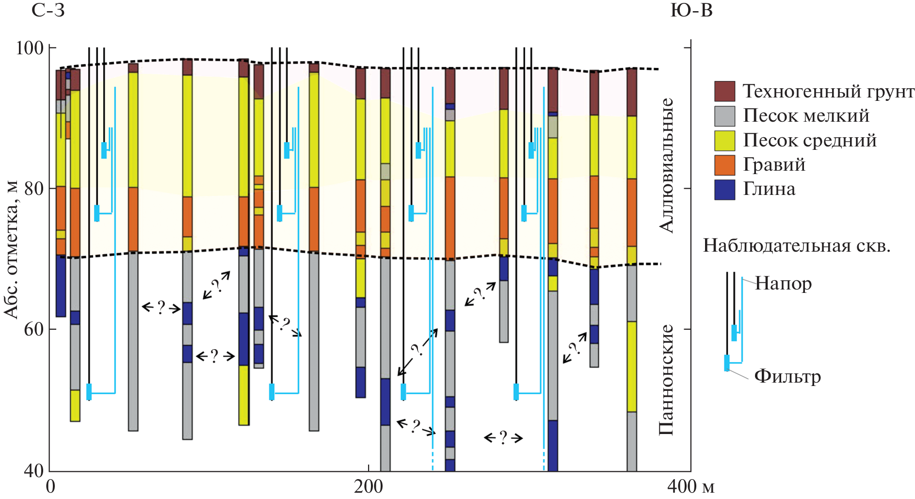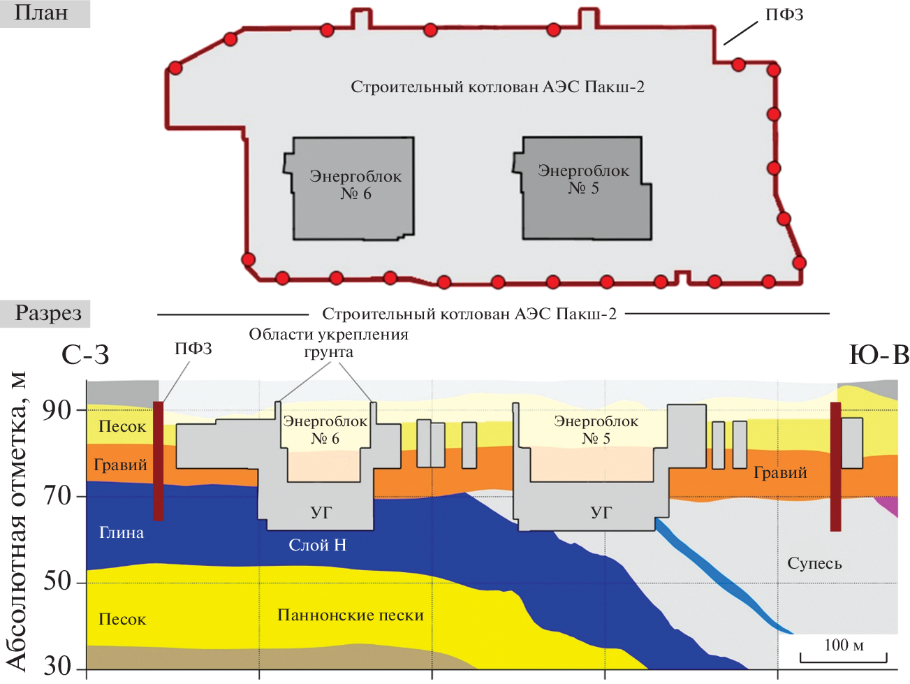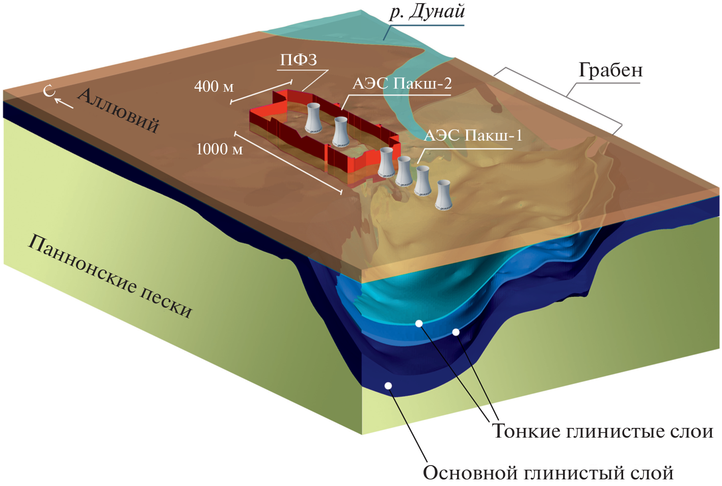 The construction of the nuclear power plant (NPP) requires conducting a large number of engineering and hydrogeological surveys, as well as assessment of the design decisions’ safety. A deep excavation pit at the Paks II NPP construction site requires execution of the cut-off wall due to extremely high groundwater saturation of the alluvial deposits. However, lithological anisotropy and the presence of dislocation zones did not allow identifying the appropriate depth for the cut-off wall construction. Unfortunately, engineering geological boreholes with a 20-meter distance between them and surface and borehole geophysical surveys could not identify the hydrogeological units. Thus, to conceptualize the hydrogeological settings, an analysis of the groundwater head distribution and the large-scale pumping tests were conducted. The interpretation of the geological data and the distinguishing of the hydrogeological units were carried out iteratively using the hydrogeological numerical model. The flow model could represent the hydraulic head distribution, the response of the lithologically heterogeneous layers to the water fluctuations in the Danube river, and the pumping tests carried out at the different depths. The results of the hydrogeological modeling revealed the aquitard to be continuous throughout the territory; however, its top’s depth changes from 30–35 to 90 m within the construction site of the Paks II NPP. This complex geometry of the aquitard is controlled by the plicated dislocation zone, which cuts the construction site in half and is revealed as the right wall of the graben.Correct hydrogeological stratification enabled us to ensure waterproof activities such as the cut-off wall construction using the hydrogeological model when excavating a deep pit for the Paks II NPP. This also minimizes the hydrodynamic impact on the closely located NPP Paks in operation.