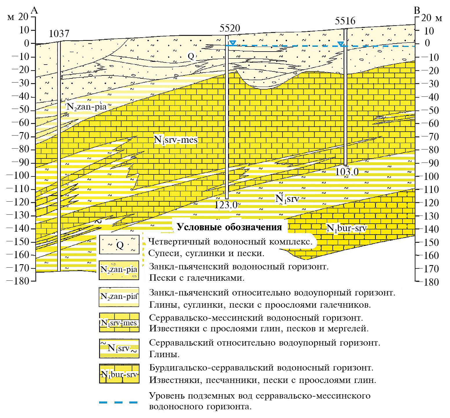 − серравальско-мессинский водоносный горизонт, представленный пористыми, трещиноватыми и закарстованными известняками с прослоями глин, песков и мергелей.