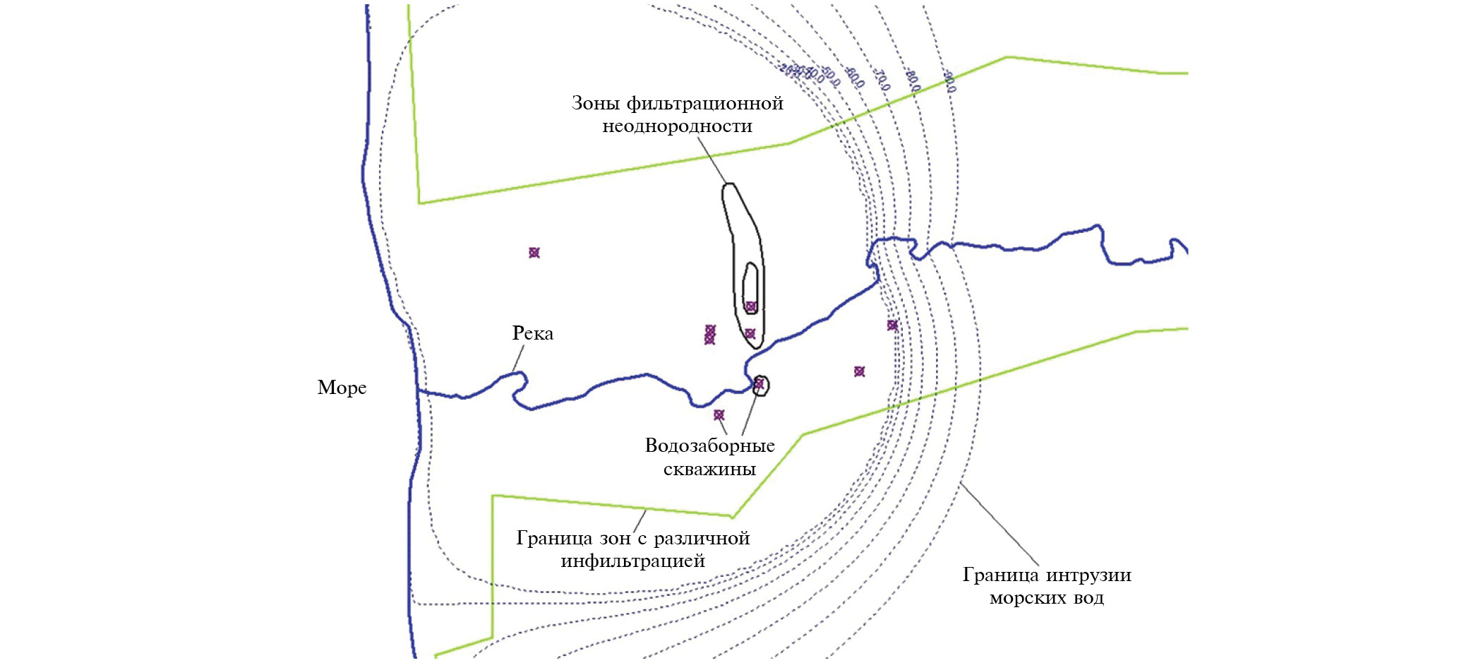 Причиной интрузии морских вод в районе исследуемого водозабора стала чрезмерно интенсивная эксплуатация водозабора, что привело к перехвату потока подземных вод и продвижению морских вод к скважинам.