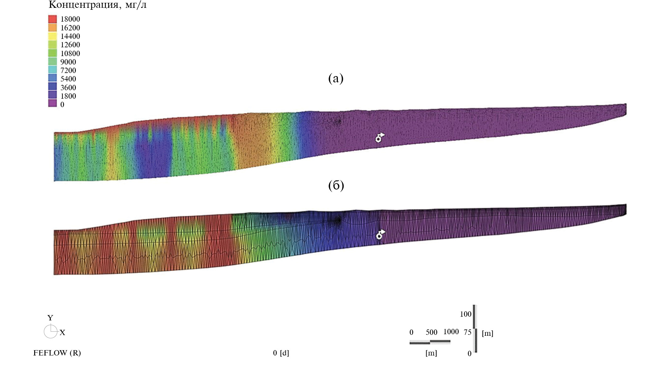 Численные модели позволяют учесть больше факторов, определяющих миграцию (влияние дисперсии, диффузии и плотностной конвекции) [2, 6, 7], в отличие от рассмотренных выше численно-аналитических методов. Следовательно, численное моделирование позволяет точно оценить распространение интрузии морских вод.
