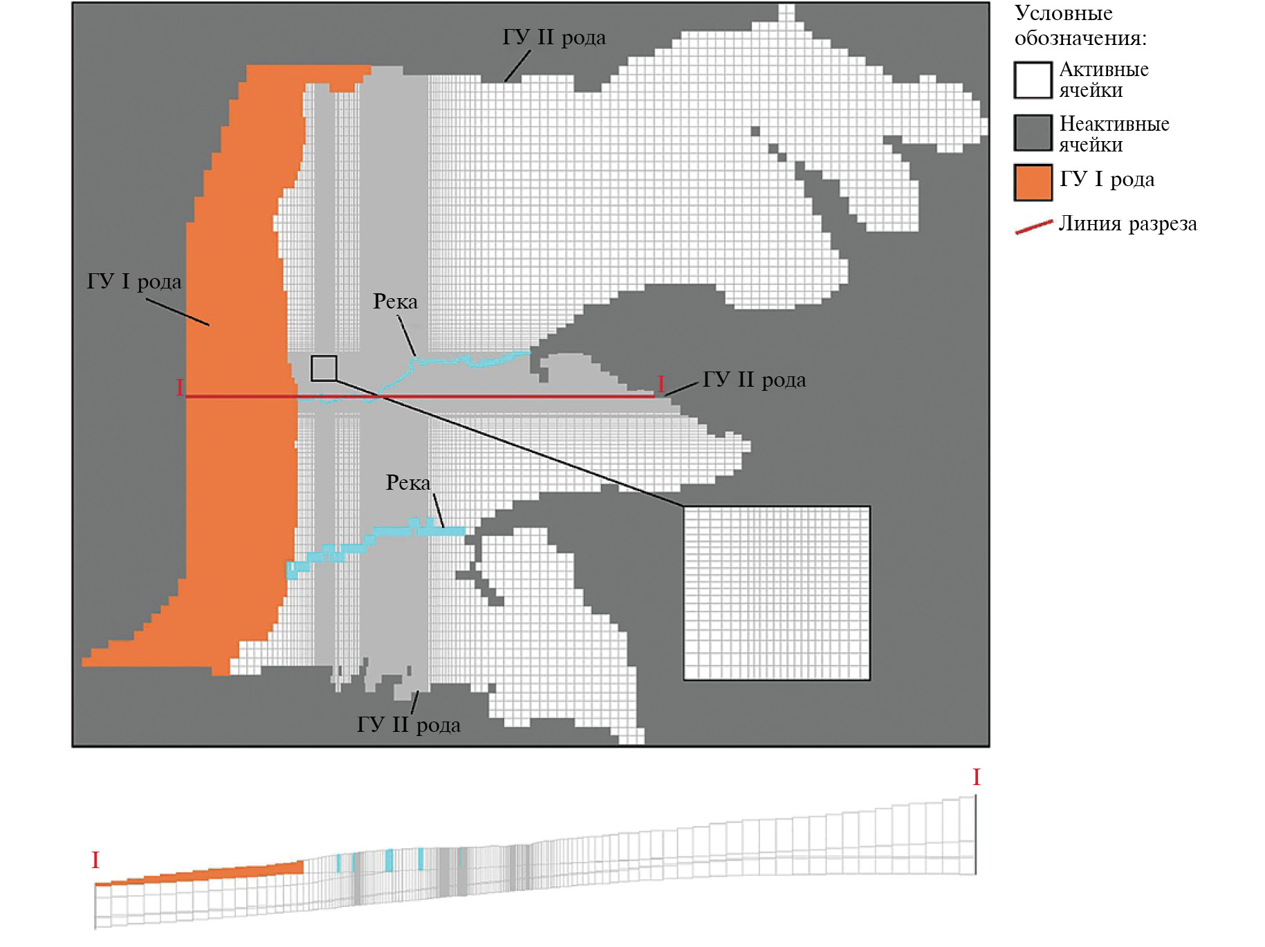 Рис. 6. Плановая дискретизация и граничные условия численной геофильтрационной модели и разрез по линии I–I по расчетной сетке.