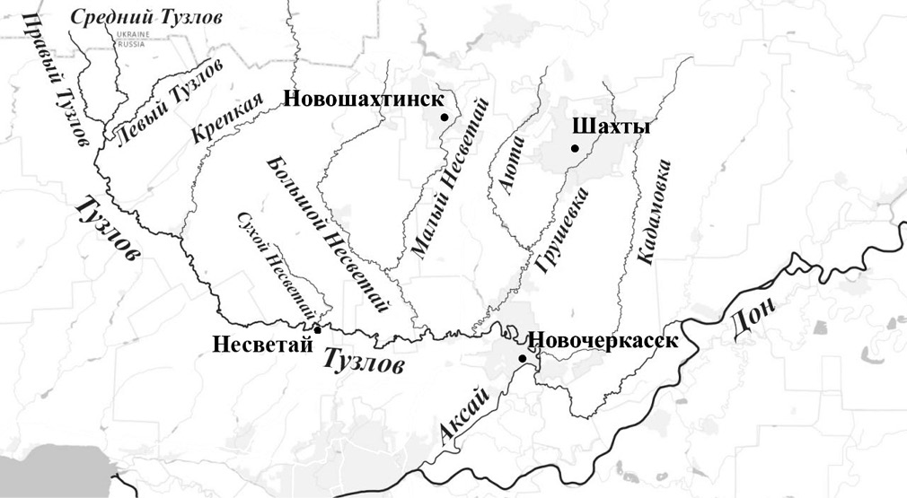 Тузлов — река степной зоны Юга России, протекающая в юго-западной части Ростовской обл. в пределах Приазовской природно-сельскохозяйственной зоны. Ее длина составляет 182 км, а площадь водосборного бассейна достигает 4680 км2. Река берет начало на южном склоне Донецкого кряжа и впадает в Проток Аксай — приток р. Дон в ее нижнем течении (рис. 1). Бассейн реки асимметричен и представлен левобережными притоками: реки Крепкая, Большой Несветай, Грушевка, Кадамовка и др. [9].