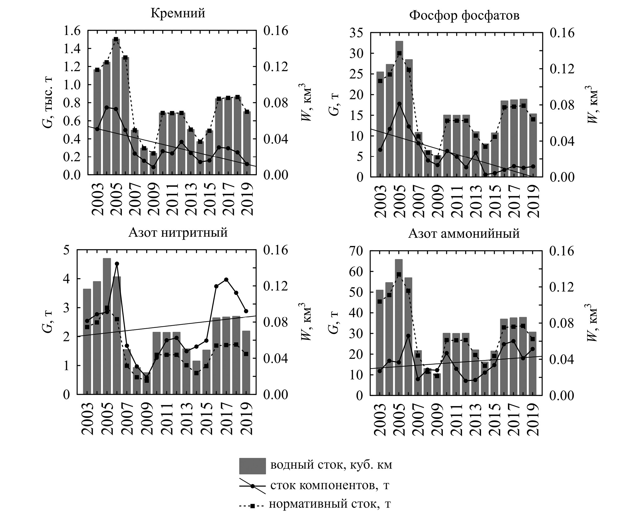 Наряду с переносом главных ионов, большой интерес представляет перенос биогенных веществ так они во многом определяют биологическую продуктивность и рыбохозяйственную значимость водных объектов. Временная изменчивость переноса соединений кремния заметно зависела от водности реки, и за весь наблюдаемый период перенос данного компонента не превышал норму (рис. 3).