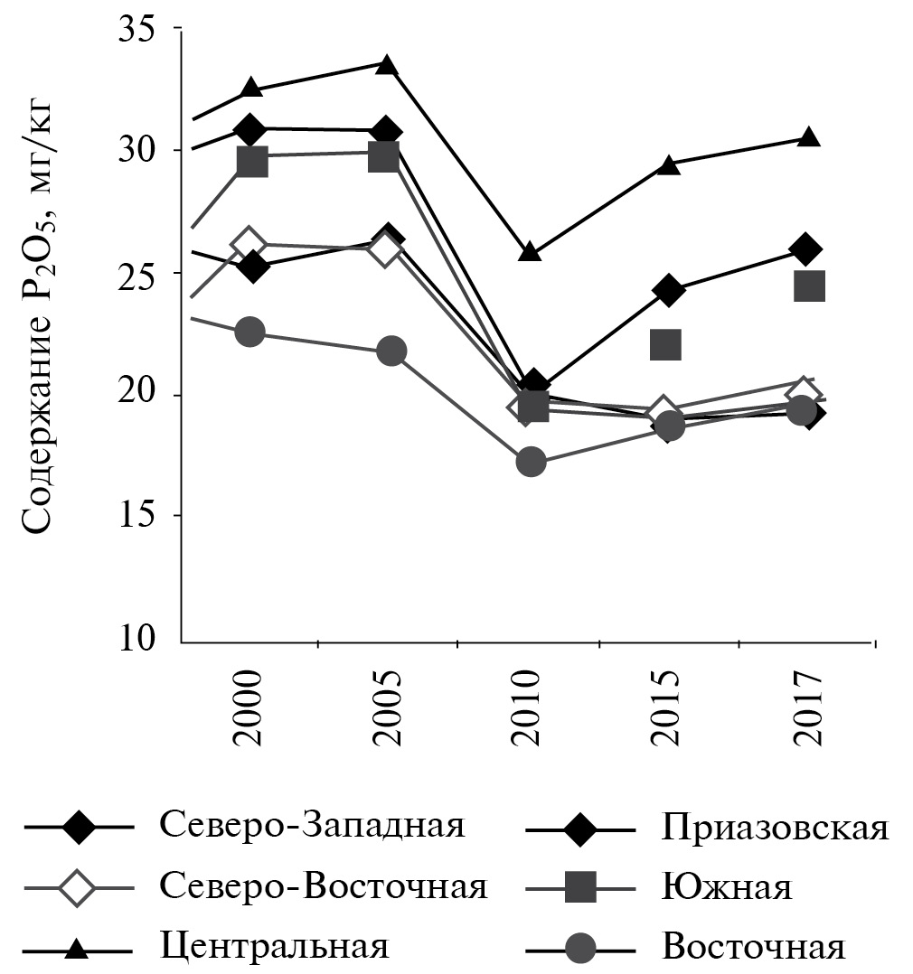 Рис. 4. Динамика содержания подвижного фосфора в пахотном слое почв в природно-сельскохозяйственных зонах Ростовской обл. [1, с изменениями].