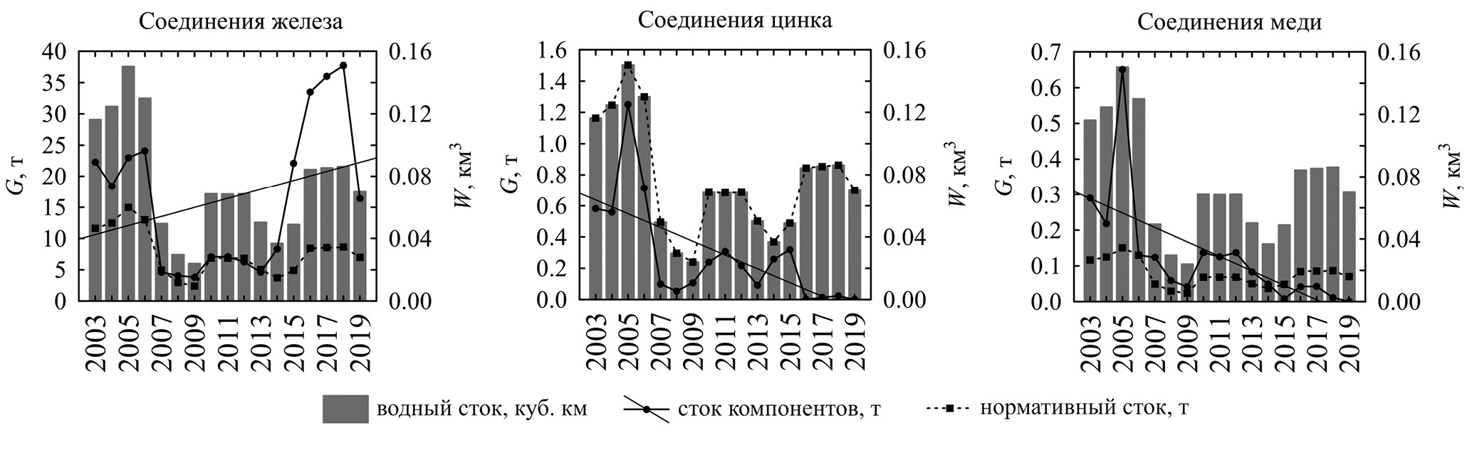 Соединения металлов, в частности железа, меди и цинка, несмотря на сравнительно невысокие их концентрации в воде водных объектов, играют важную роль в метаболических процессах гидробионтов и функционировании речных экосистем. Перенос соединений железа общего характеризовался неустойчивостью: его зависимость от водности не была постоянной в течение рассматриваемого периода. Резкое увеличение переноса данного компонента в 2014 и 2015 г. вплоть до стремительного снижения в 2019 г. вызвано преимущественно возрастанием его концентрации в воде (рис. 5). Даже в условно многоводный период (2003–2006 гг.) перенос был заметно ниже.