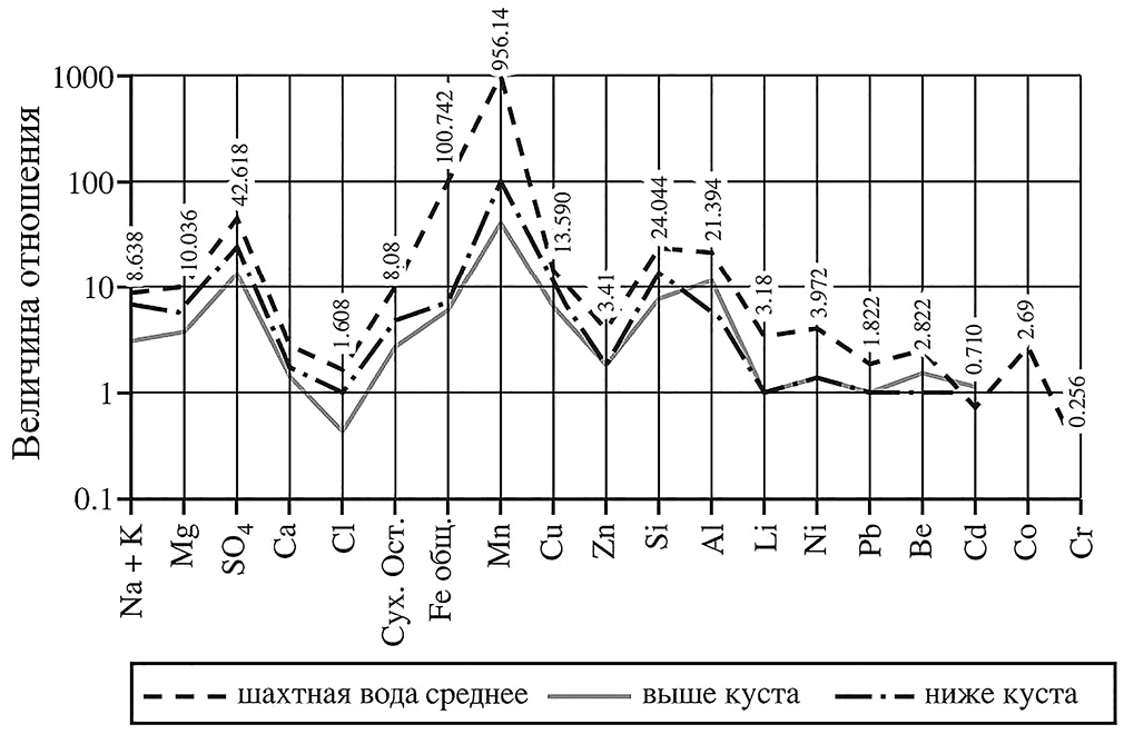 Несмотря на то, что на данном участке проявляются все вышеперечисленные антропогенные факторы, роль шахтных вод совершенно очевидна, что подтверждается весьма симбатными геохимическими спектрами техногенных шахтных и речных вод в пределах бассейна (рис. 6).
