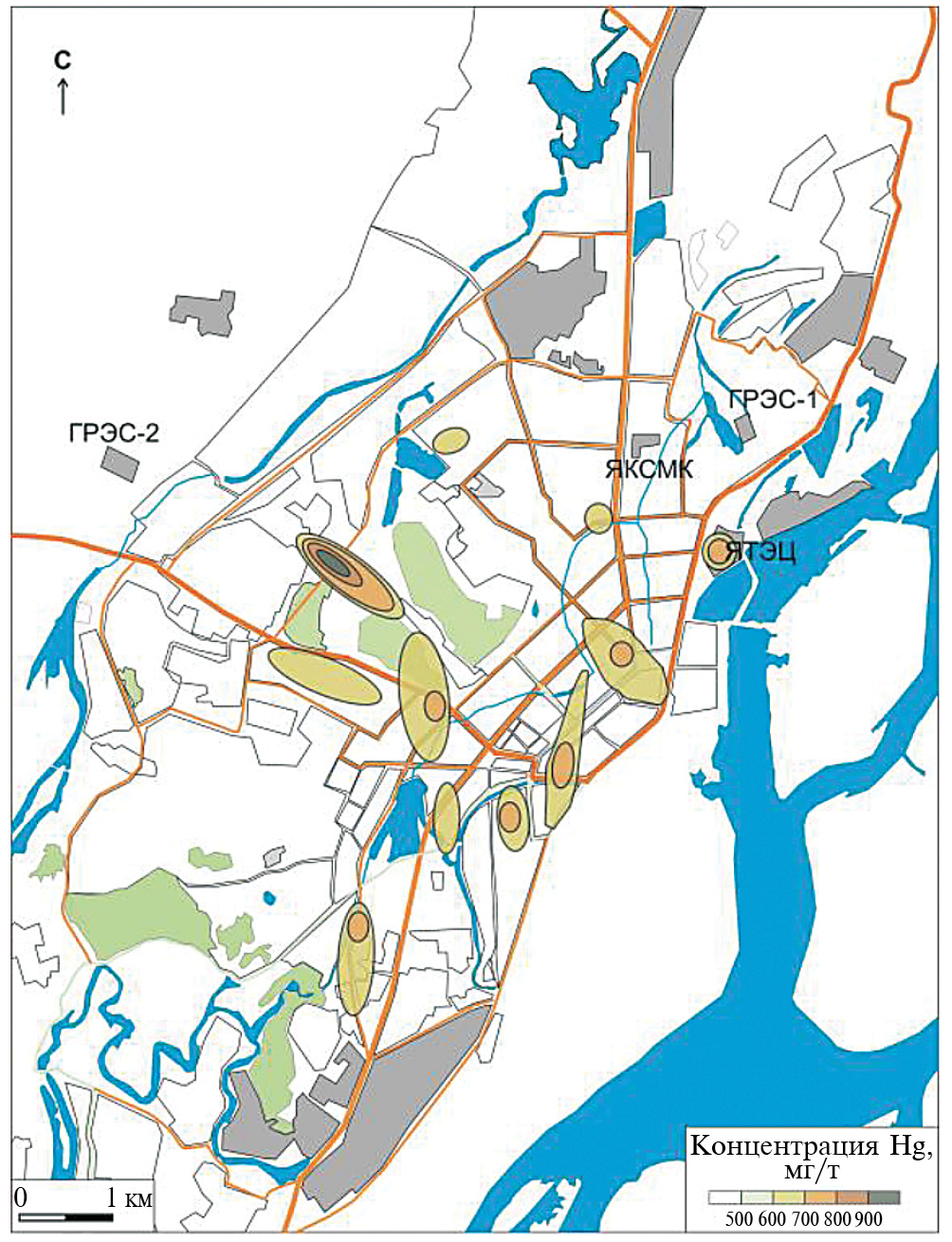 Рис. 2. Аномалии Hg в почвах Якутска (2018 г.).