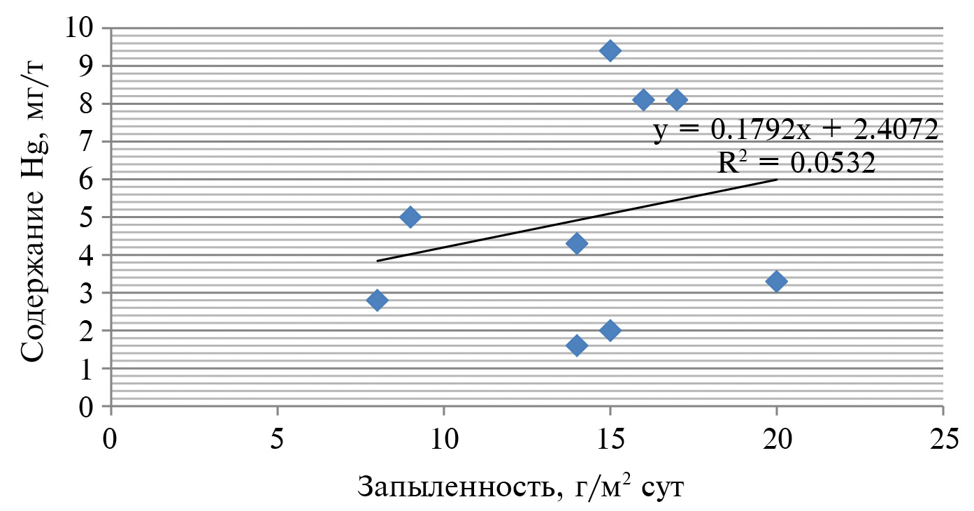 Концентрации Hg в атмосферной пыли и почвах практически идентичны. Наблюдается очень слабая зависимость возрастания содержания Hg от увеличения запыленности атмосферы (рис. 3).