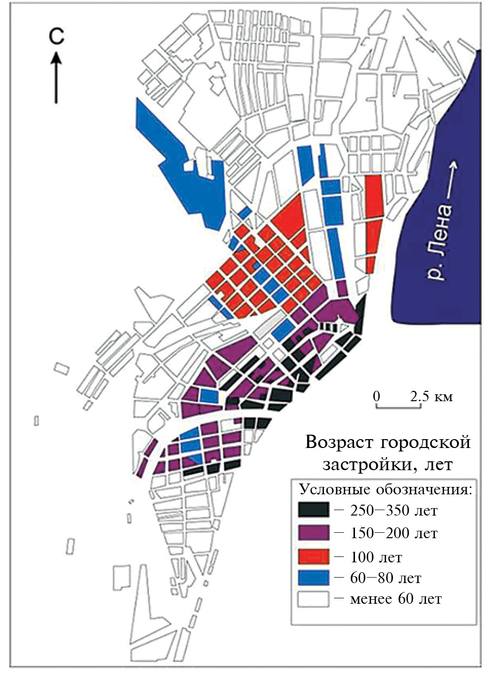 Рис. 4. Возраст городской застройки Якутска (составлен по планам и картам города с XVIII в. и по настоящее время).