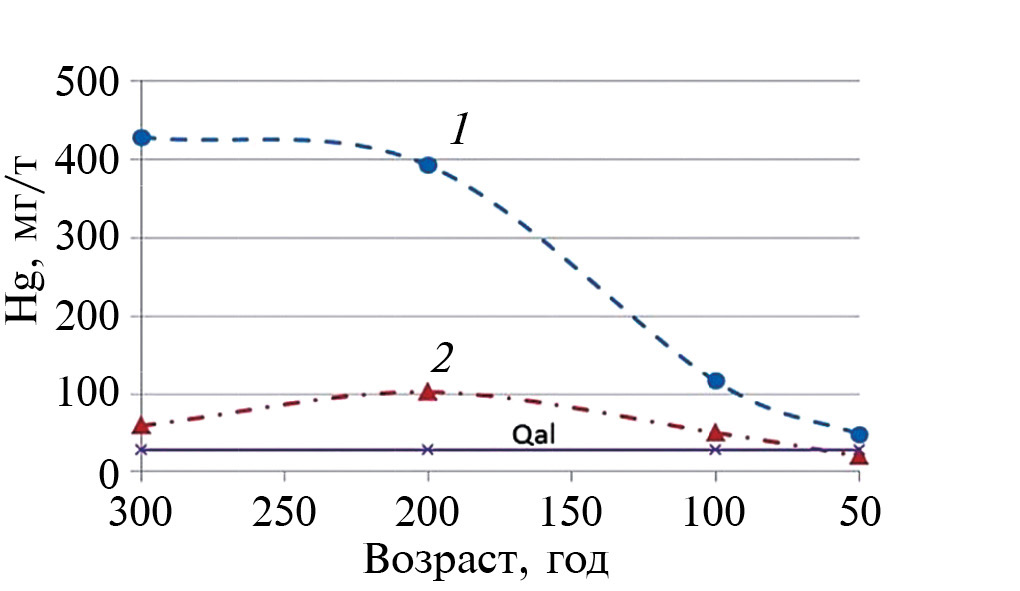 Среднее содержание Hg в грунтах КС “деревенского” периода, возраст которых более 100 лет, колеблется в пределах 50–100 мг/т, что вполне сопоставимо с данными Я.В. Зачиняева [8] о биофильном накоплении Hg.
