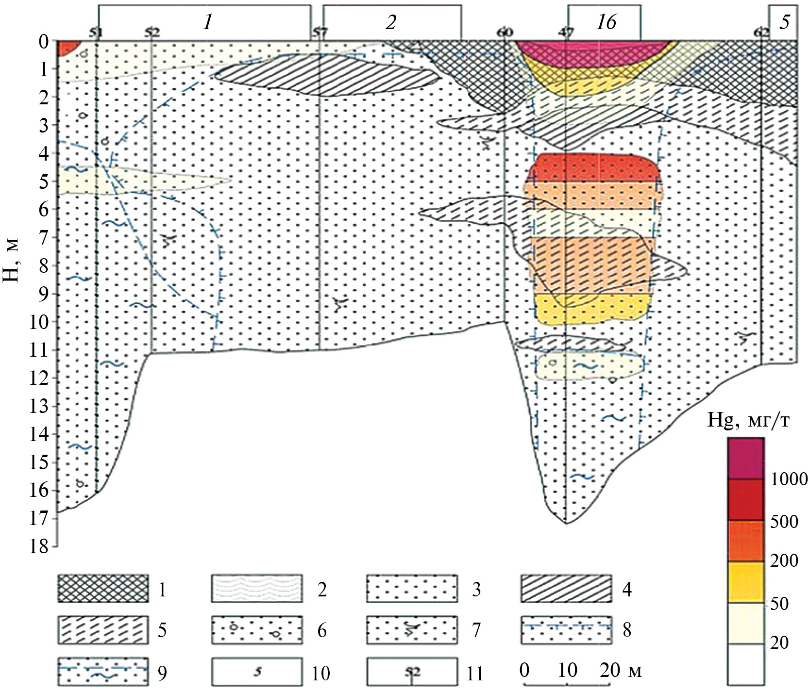 Рис. 6. Литохимические аномалии Hg в грунтах талика, мг/т. 1 – грунт насыпной; 2 – почвенно-растительный слой; 3 – песок; 4 – суглинок; 5 – супесь; 6 – песок с галькой; 7 – песок с органикой; 8 – граница мерзлых пород; 9 – водоносный горизонт; 10 – здания и сооружения ЯТЭЦ: 1 – главный корпус, 2 – здание водогрейных котлов, 5 – углекислотный цех, 16 – химводоочистка; 11 – номер буровой скважины.