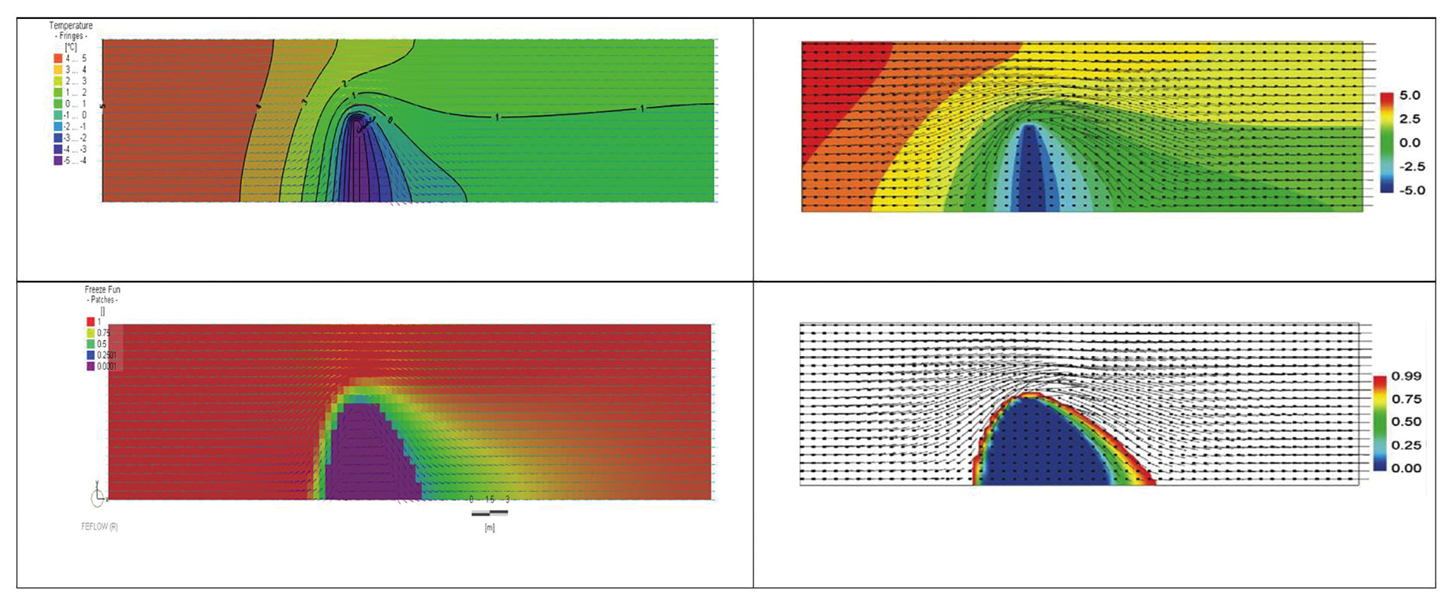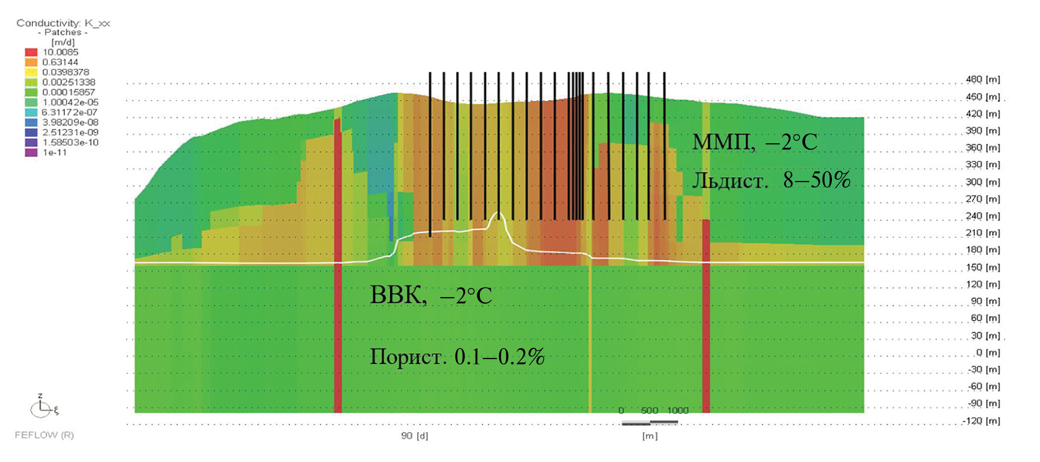 В решении задач, когда необходимо учитывать движение потока подземных вод, важен учет влияния промерзания на проницаемость коллектора. Основная идея учета влияния промерзания на проницаемость грунтов заключается в том, что при достижении температур ниже температуры замерзания воды происходит уменьшение значений коэффициентов фильтрации. Так, в работе [2] предлагается постепенное изменение проницаемости при переходе температуры через ноль. Степень перехода в этих статьях предлагается равной уменьшению коэффициентов фильтрации на несколько порядков. В предлагаемой нами модели, реализованной с помощью модуля FreezeThaw75, переход от талого состояния грунта к мерзлому осуществляется для случая, когда все узлы элементарной ячейки модели имеют температуру ниже температуры замерзания.