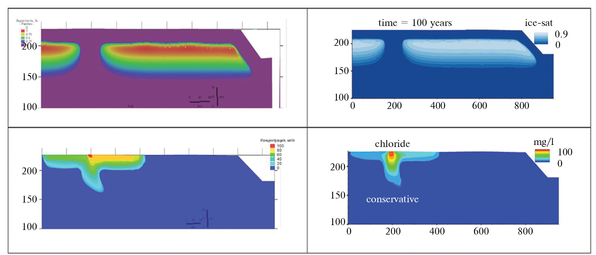 Расчеты выполнены при одинаковых условиях по фильтрации, тепло- и массопереносу. В качестве мигрирующего компонента рассматривается сценарий миграции хлоридов с максимальной концентрацией 100 мг/л. Если вода имеет повышенную минерализацию, то происходит депрессия температуры замерзания, которая может быть оценена следующим образом. Зависимость температуры замерзания Tf (°C) от минерализации C (мг/л) предлагается рассмотреть по следующей зависимости [12]: