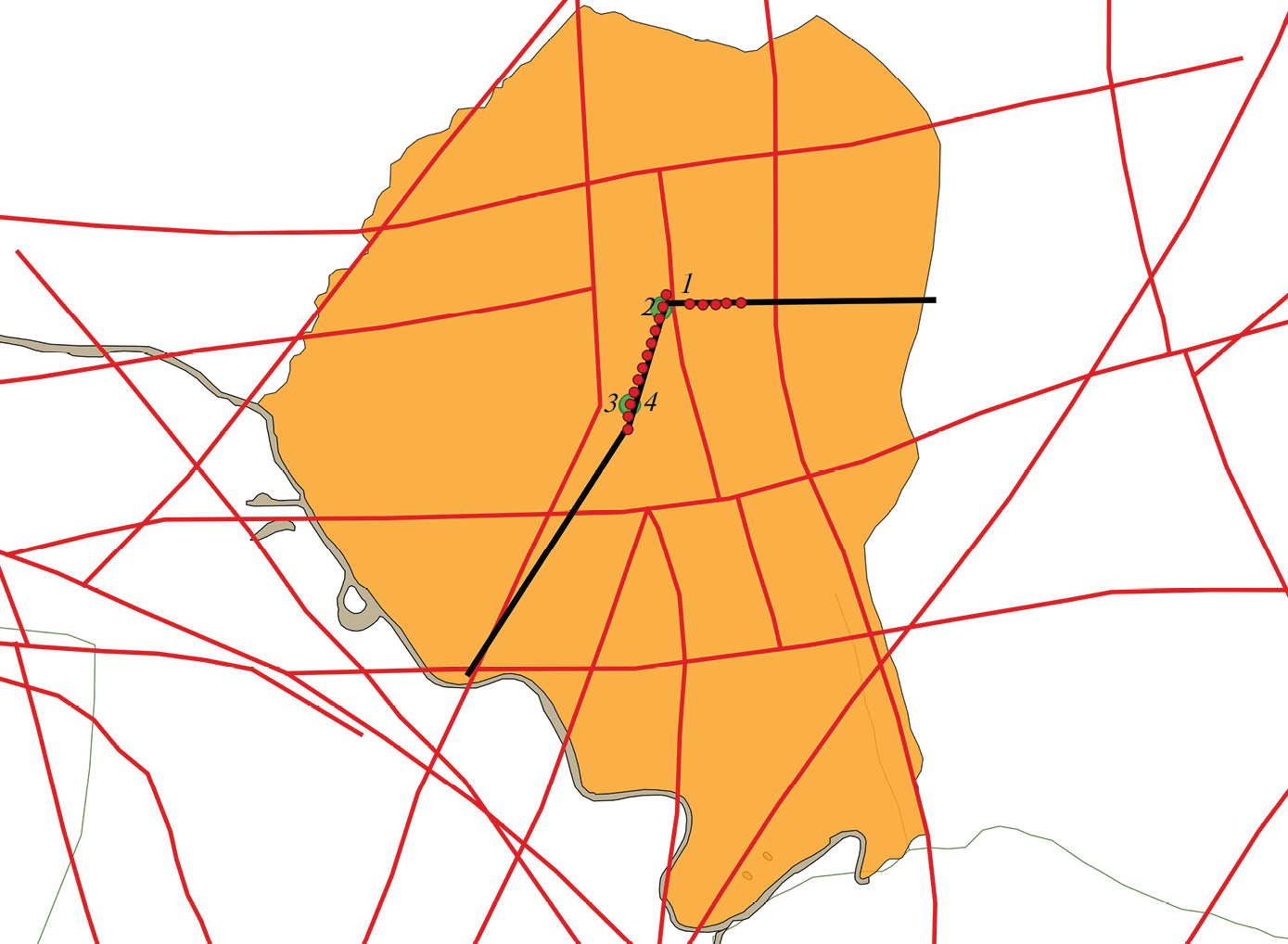 Рис. 6. Схема расположения объекта моделирования с системой разломов (красные линии). Скважины: закачки − красные кружки, наблюдательные – зеленые; цифры − номера скважин. Линия разреза показана черным цветом.