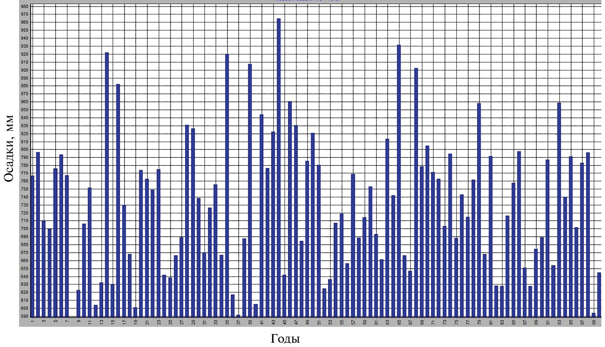 Результаты расчета водного баланса выводятся программой для каждых суток, месяца, года и суммарно за расчетный период. Пример сгенерированных программой в многолетнем разрезе годовых осадков показан на рис. 1.