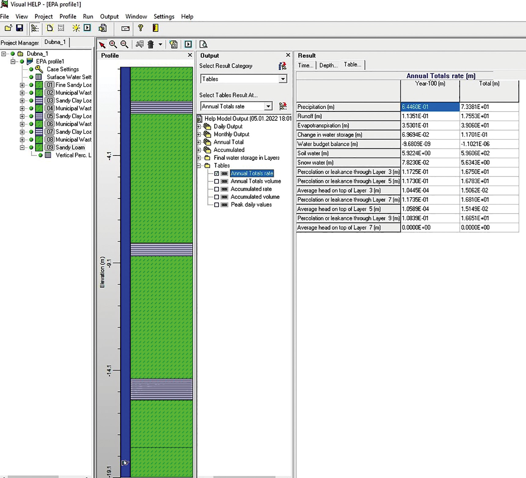 Расчет водного баланса свалочного тела на полигоне ТКО в Дубне выполнен при помощи программы HELP, которая представляет гидрологическую модель водного баланса полигонов (открытых и закрытых с поверхности) и других сооружений складирования ТКО. Программа разработана в США Агентством по охране окружающей среды (US EPA) для выбора и проектирования оптимальной конструкции полигона ТКО в отношении обеспечения минимальных утечек фильтрата в подземные воды на основе анализа водного баланса свалочного тела. Программа позволяет учесть в конструкции полигонов различные комбинации составляющих его элементов: растительность, насыпной грунт, отходы, боковой дренаж, изолирующие грунты с низкой проницаемостью и синтетические геомембранные вкладыши.