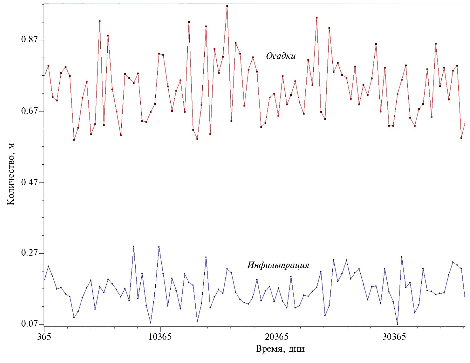 Рис. 4. Результаты расчета суточных осадков (1) и инфильтрации (2) в течение 100 лет (вар. 2).