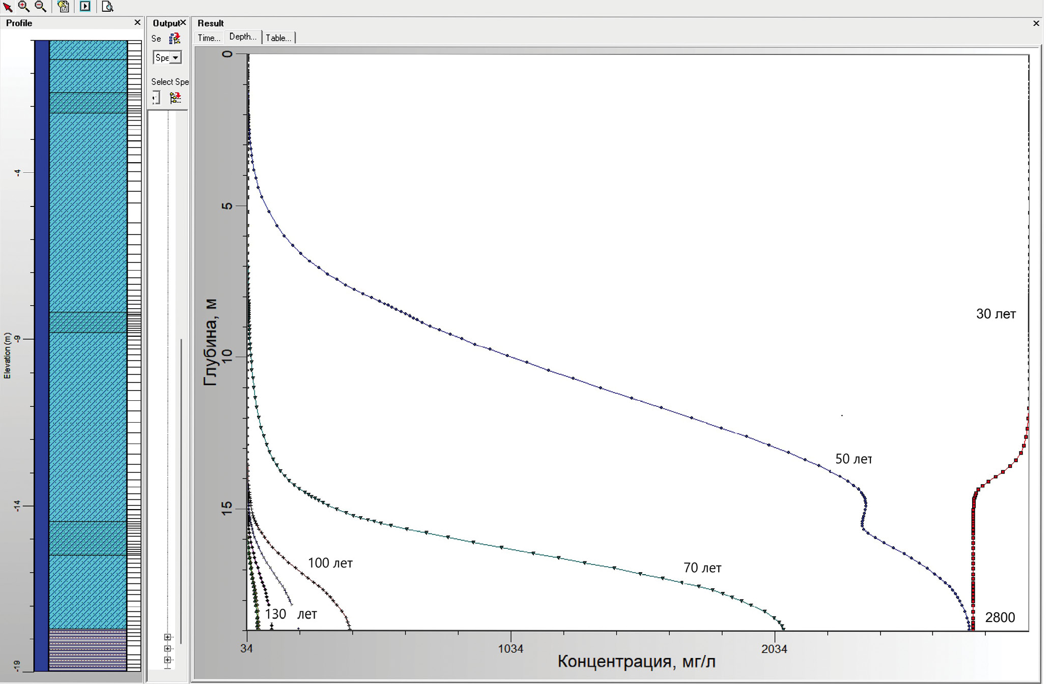 Задав характерные параметры свалочного тела объекта-аналога: срок существования, мощность, коэффициенты фильтрации отходов и изолирующих суглинков, интенсивность инфильтрации и диапазон изменения концентрации Cl– в фильтрате, по программе VS2DT для свалочного тела в Дубне были рассчитаны концентрации Cl– во влаге по всему его профилю, а также поступающие на УПВ под ним на разные моменты времени, в том числе на конец расчетного периода (23 года). Полученные результаты расчета совпали с концентрациями Cl– в подземных водах на объекте-аналоге, тем самым была подтверждена возможность применения программы VS2DT для расчета миграции хлорид-иона в свалочном теле и использования данных о концентрации Cl– в фильтрате на объекте-аналоге (3000–5500 мг/л) для подбора значений его концентраций в фильтрате на полигоне в Дубне.