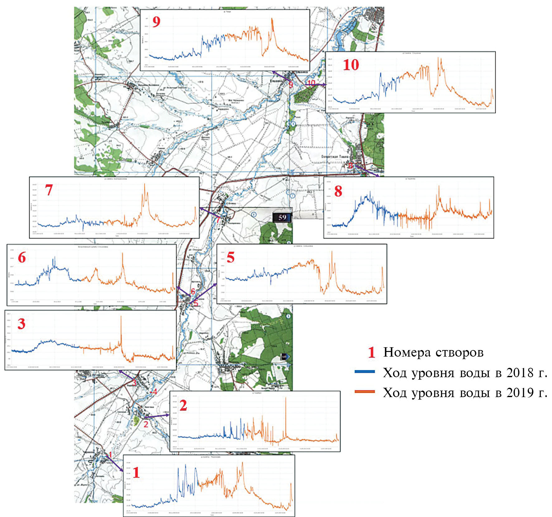 Рис. 1. Схема расположения привлеченных к исследованию рек в бассейне р. Свияга с графиками хода уровней воды. На карте обозначены створы: 1 – р. Свияга (створ Чириково); 2 – р. Чамбул (створ Хвостиха); 3 – руч. Чечерка (створ Порецкое); 5 – р. Свияга (створ Спешневка); 6 – руч. б/н (створ Спешневка); 7 – р. Свияга (створ Екатериновка); 8 – р. Ташелка (створ Солдатская Ташла); 9 – р. Гуща (створ Елшанка); 10 – р. Свияга (створ Елшанка). Створ 4 (р. Свияга (створ Порецкое) располагается в 50 м ниже устья руч. Чечерка (наблюдения на створе не удалось завершить из-за поломки логгера).
