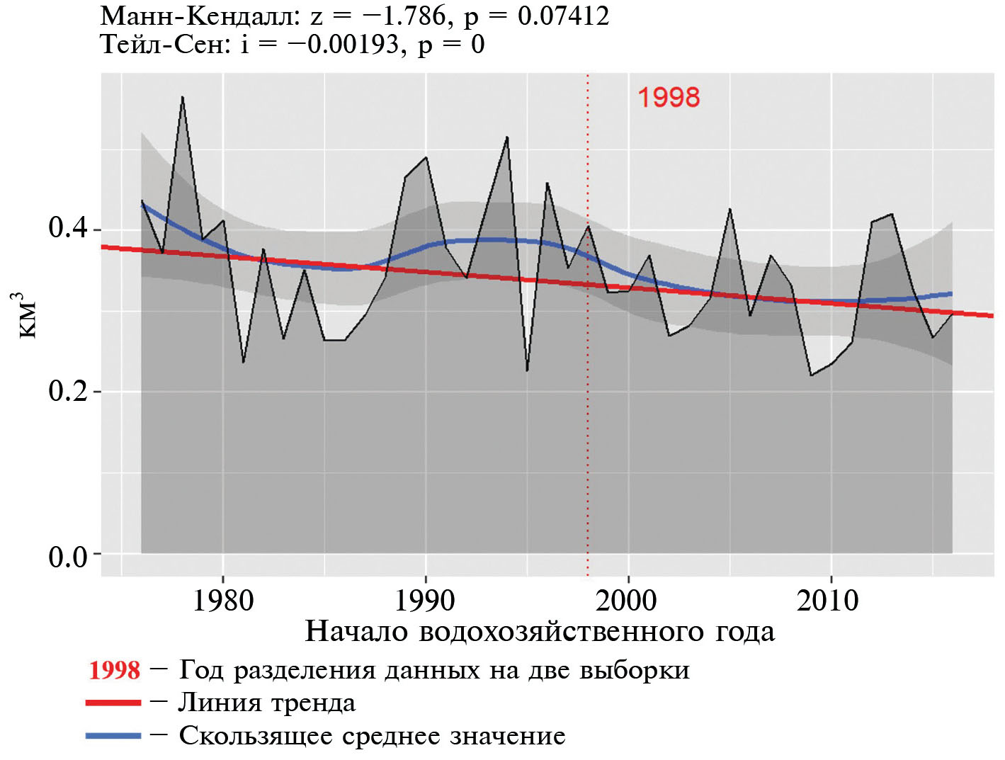 В результате анализа установлено, что объем годового стока р. Свияга имеет тенденцию на уменьшение (рис. 4).