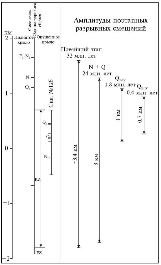 На ней показаны весьма приблизительно и округленно определенные амплитуды дифференцированных разрывных смещений по Южнокодарскому сбросу за: