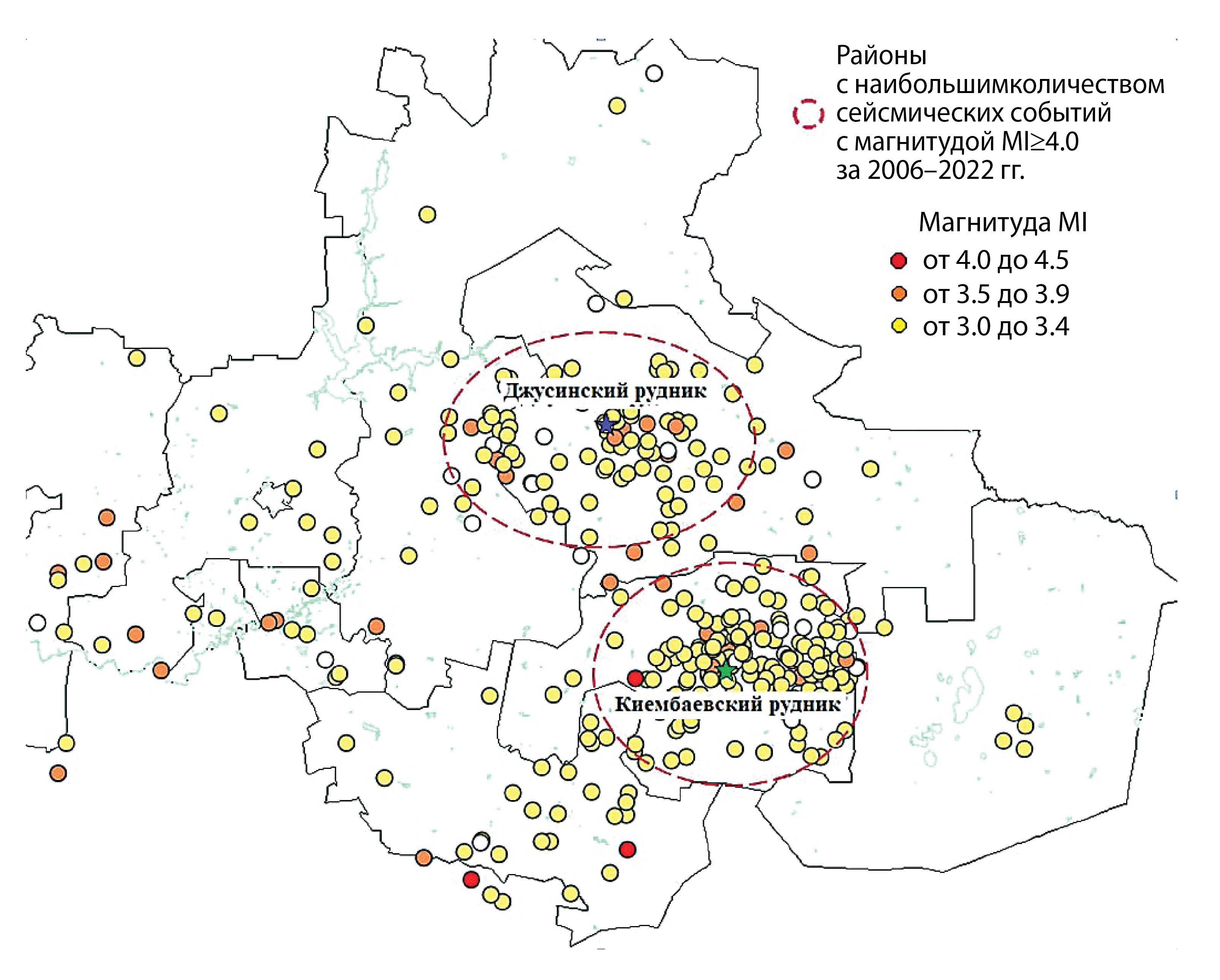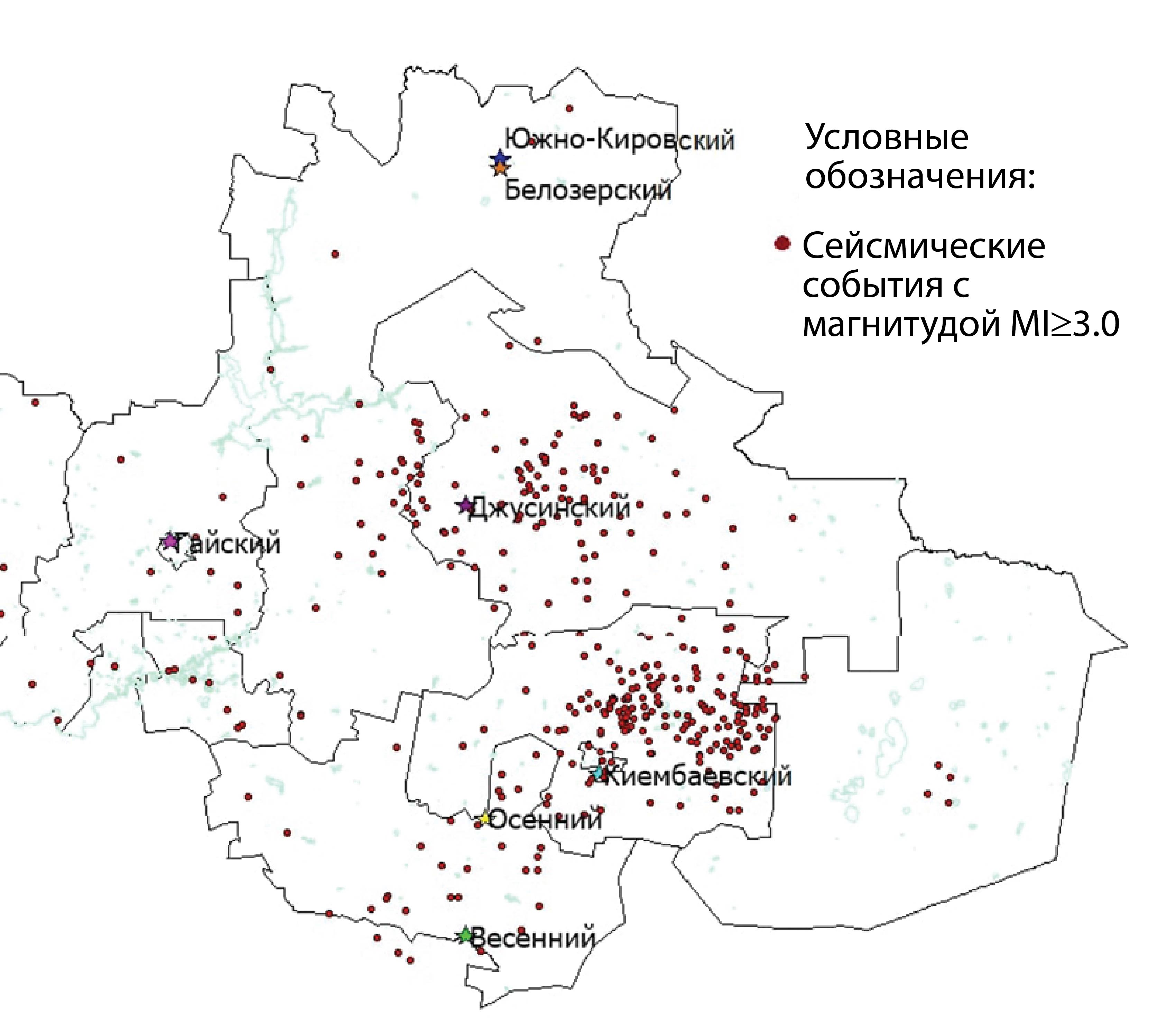 Наиболее сейсмоактивные районы выделены в пределах Киембаевского рудника (Ясненский район) и Джусинского рудника (Адамовский район). Здесь сосредоточено наибольшее количество сейсмических событий с магнитудой Ml ≥ 3.0.