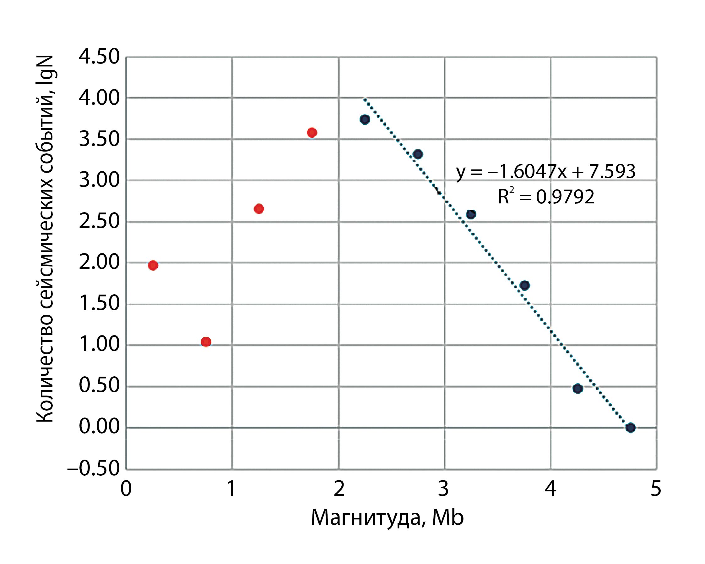 Проведена оценка представительной магнитуды. Построен график повторяемости сейсмических событий. Выполненный анализ графика повторяемости регистрируемых сейсмических событий показал, что диапазон представительной магнитуды начинается с 2.0.