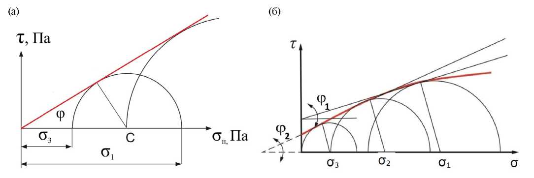 Рис. 1. Диаграмма сдвига, построенная в соответствии с теорией Мора-Кулона, для песчаного грунта (а) и полученная по экспериментальным данным для глин (б, красная линия).